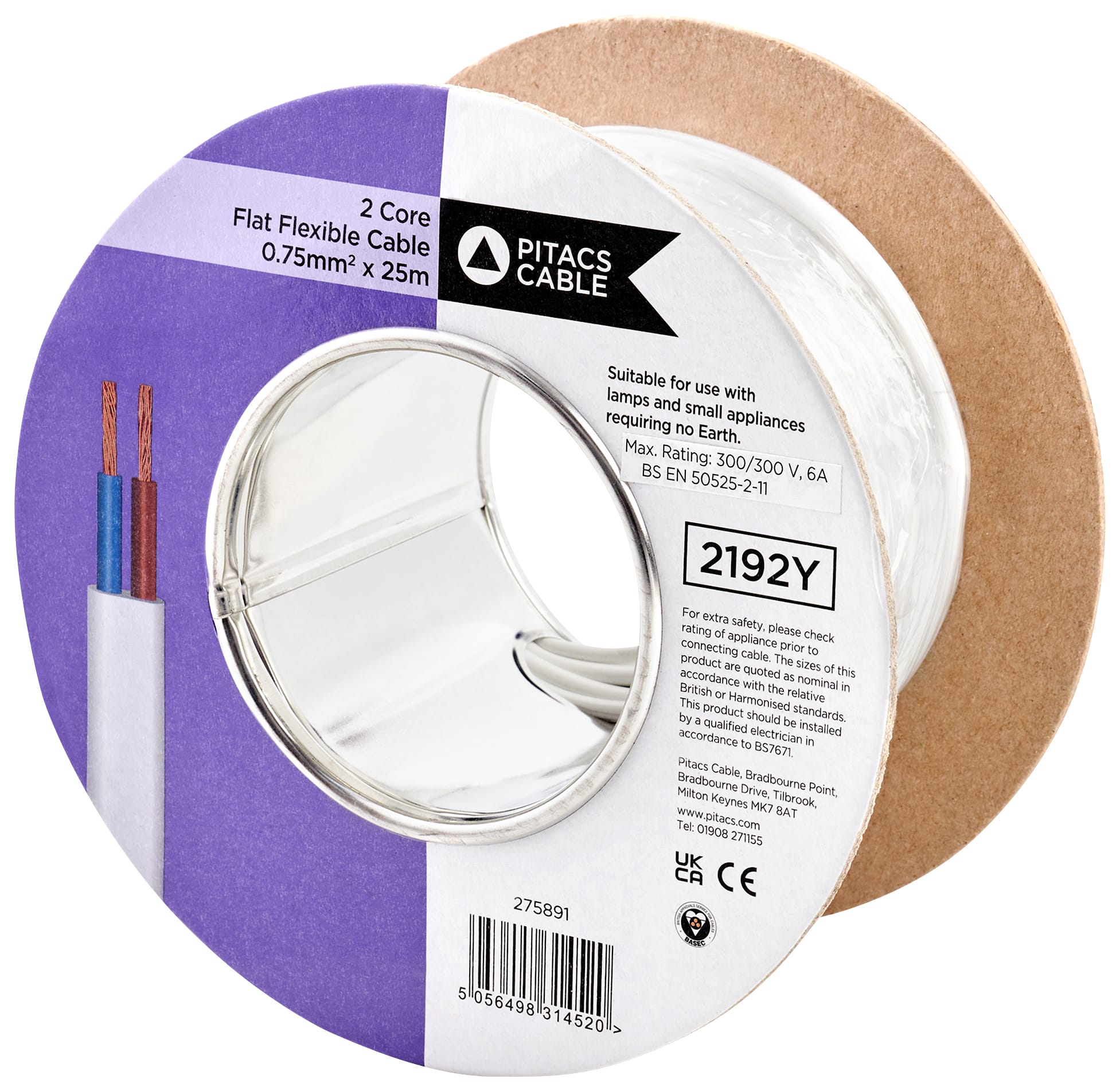The 2 Core 2192Y Flat Flexible Cable is designed for use as general supply lead for small domestic appliances and pendant lighting drops. Not recommended for use with heating and cooking appliances. This 25m roll of cable features 0.75mm2 conductors, ensuring optimal conductivity and flexibility for a variety of applications. The flat, flexible design makes it ideal for installations where space is limited or where discreet wiring is desired.
