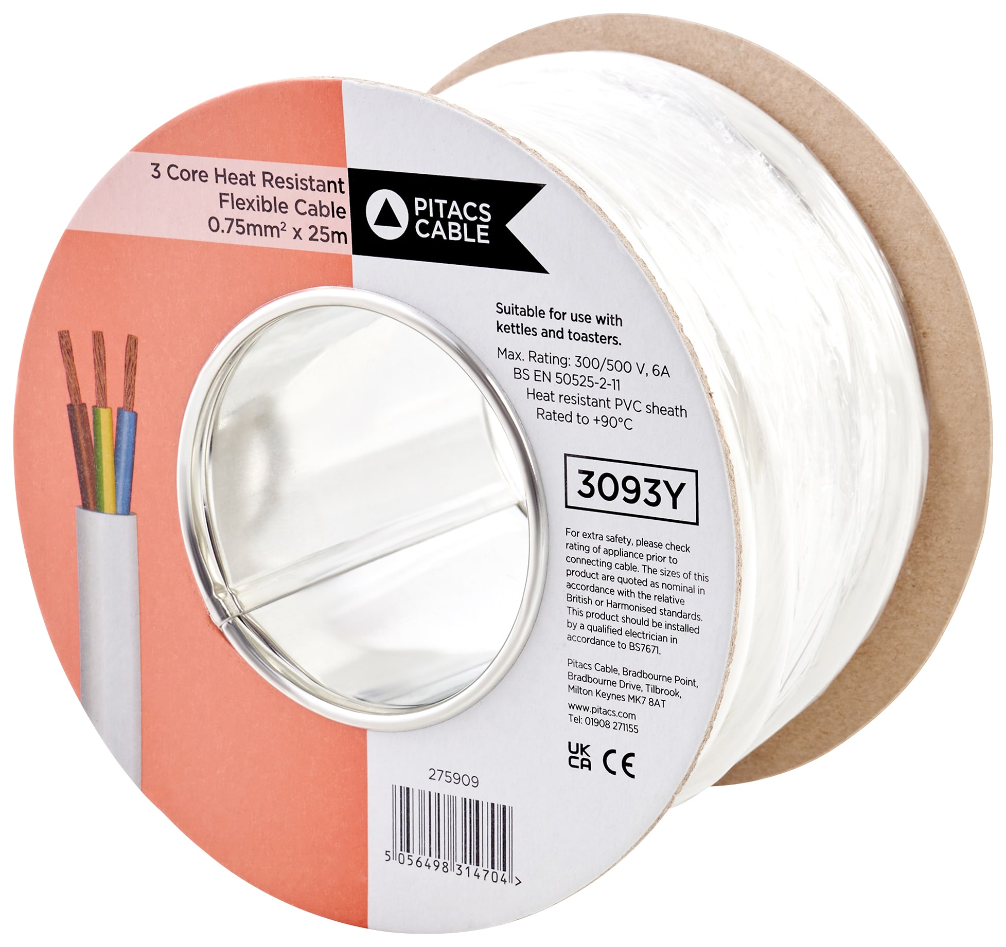 The 3 Core 3093Y Heat Resistant Flexible Cable is designed for internal wiring or supply cords to electrical apparatus. Suitable for installation in high temperature environments up to +90° where there is low risk of mechanical stresses. Not suitable for outdoor use, or laying on trays or in racks. This 25m roll of cable features 0.75mm2 conductors, ensuring optimal conductivity and flexibility for a variety of applications. This cable comprises three insulated cores, providing a secure and efficient electrical connection.
