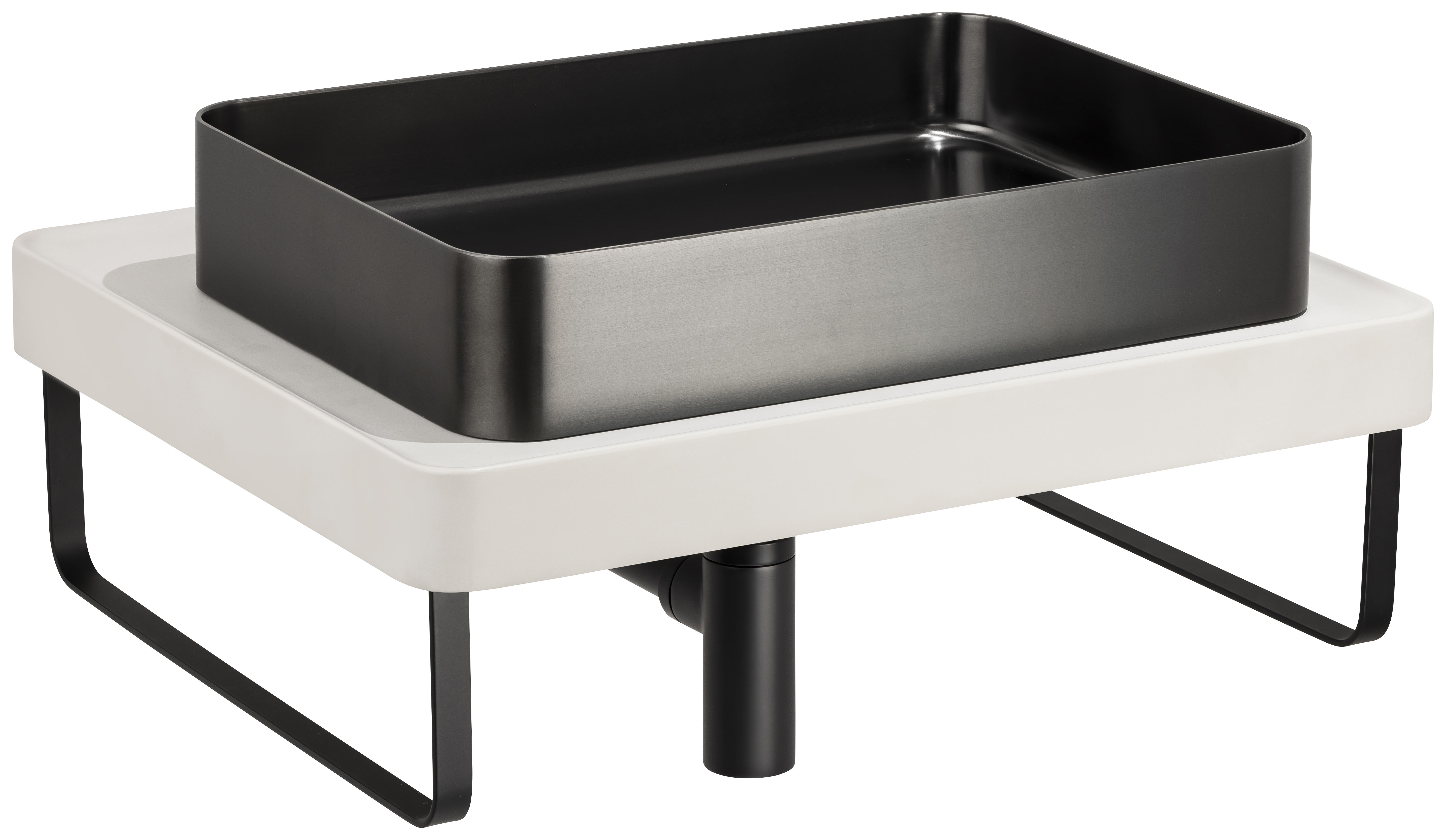 - Includes: Rectangular countertop steel matt black basin, universal clicker waste, bottle trap, worktop, metal wall brackets, towel rail & fixings