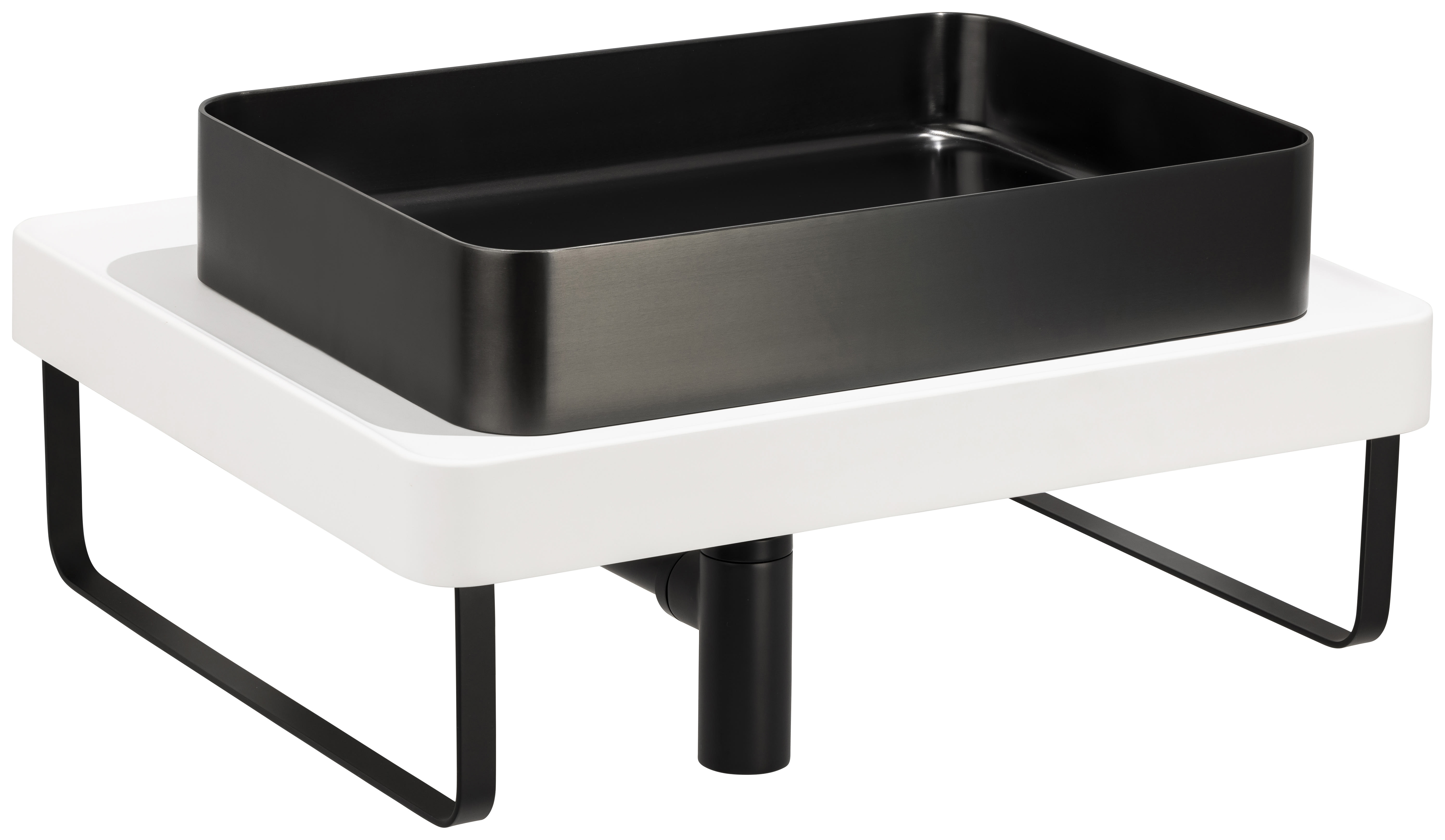 - Includes: Rectangular countertop steel matt black basin, universal clicker waste, bottle trap, worktop, metal wall brackets, towel rail & fixings
