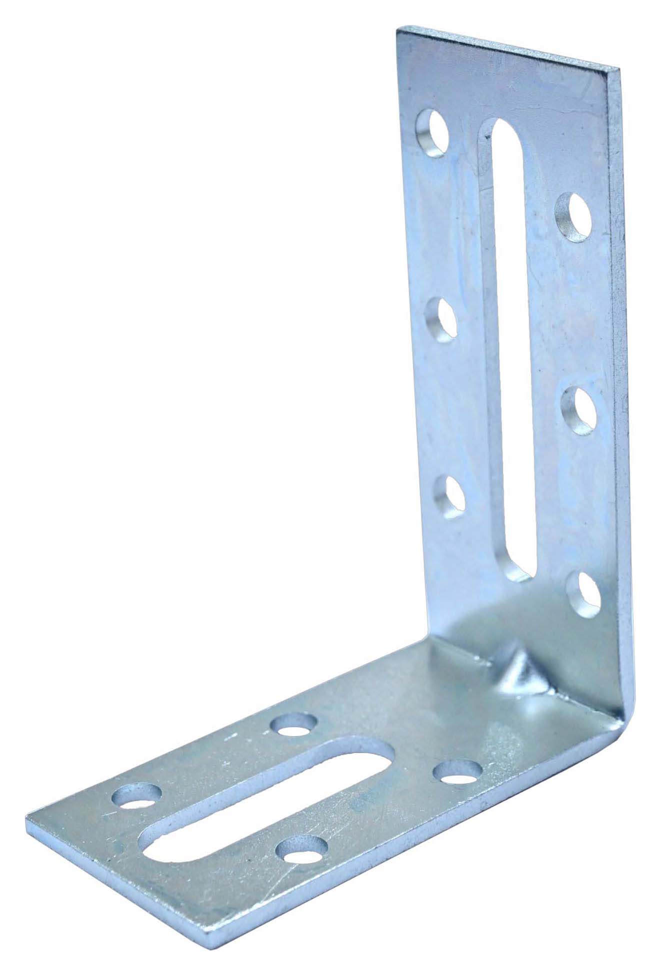 A galvanised 90 degree connector from Wickes, with two slots and multi hole pattern designed for easy adjustment.