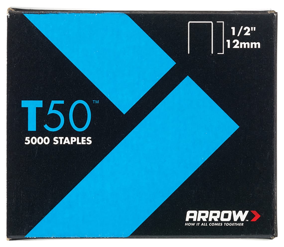 The Arrow T50 Series top quality 0.050 wire staples for T50, T55, T50PBN, HT50P (up to 12mm only), HTX50, ETFX50, ETF50PBN, CT50K, 5700 and 8000. Size: 12mm (1/2in) which come in an Industrial bulk pack of 5,000. These staples are for use around the home, worksite & office.