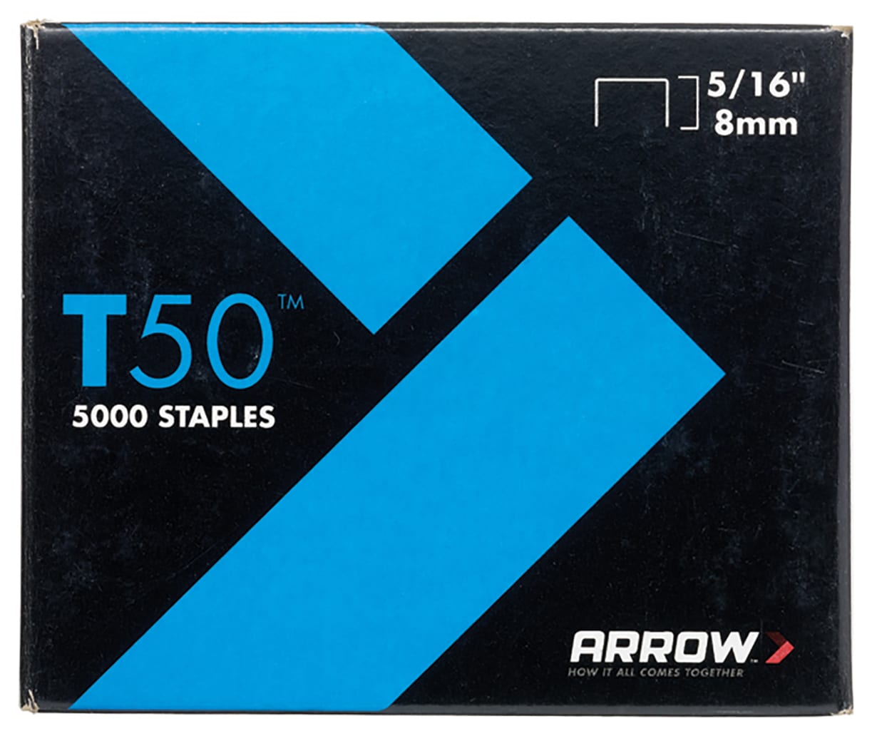 The Arrow T50 Series top quality 0.050 wire staples for T50, T55, T50PBN, HT50P (up to 12mm only), HTX50, ETFX50, ETF50PBN, CT50K, 5700 and 8000. Size: 8mm (5/16in). which come in an Industrial bulk pack of 5,000. These staples are for use around the home, worksite & office.