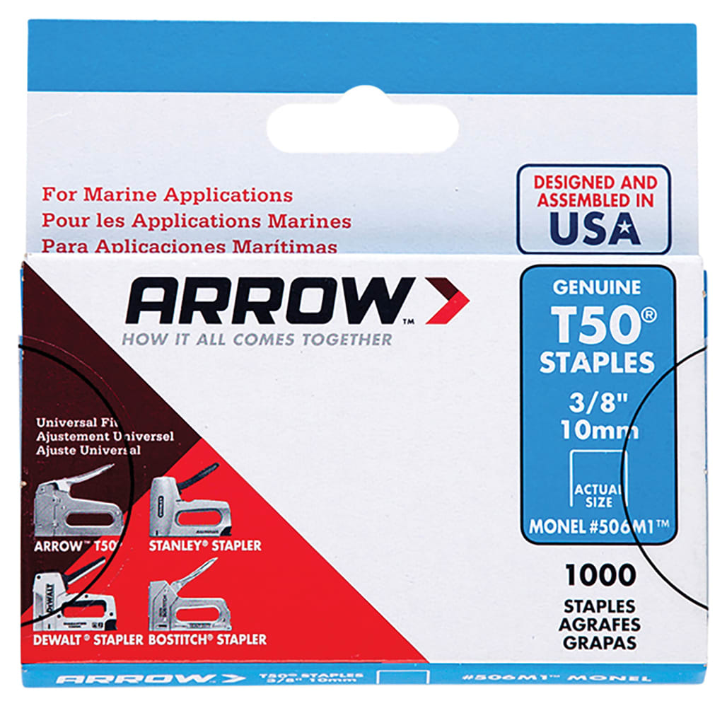 The Arrow T50M 506m Monel Staples 10mm (3/8in) - Pack of 1000 Monel staples have a rustproof finish and are recommended for their durability and resistance to corrosion. Totally waterproof and can be used under water. For use with T50, T55, T50PBN, HT50P, HTX50, ETFX50, ETF50PBN, CT50K, 5700 and 8000. The Arrow ARRT5038MS T50M 506m Monel staples come in the following: Box quantity: 1000, Size: 10mm - 3/8 inch.