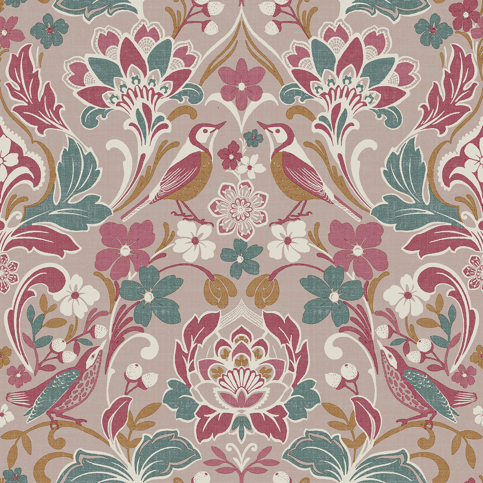Infuse your home with the charming elegance of this Folk Floral wallpaper in pink. This delightful design showcases intricate patterns of birds and flowers set against a soft pink background. The detailed artwork brings a timeless appeal that beautifully complements both classic and contemporary interiors. Ideal for creating a cosy and inviting atmosphere, this wallpaper works wonderfully as a feature wall or across all walls for a harmonious look. Perfect for living rooms, bedrooms, or dining areas, it is suitable for most rooms except high moisture environments like bathrooms.