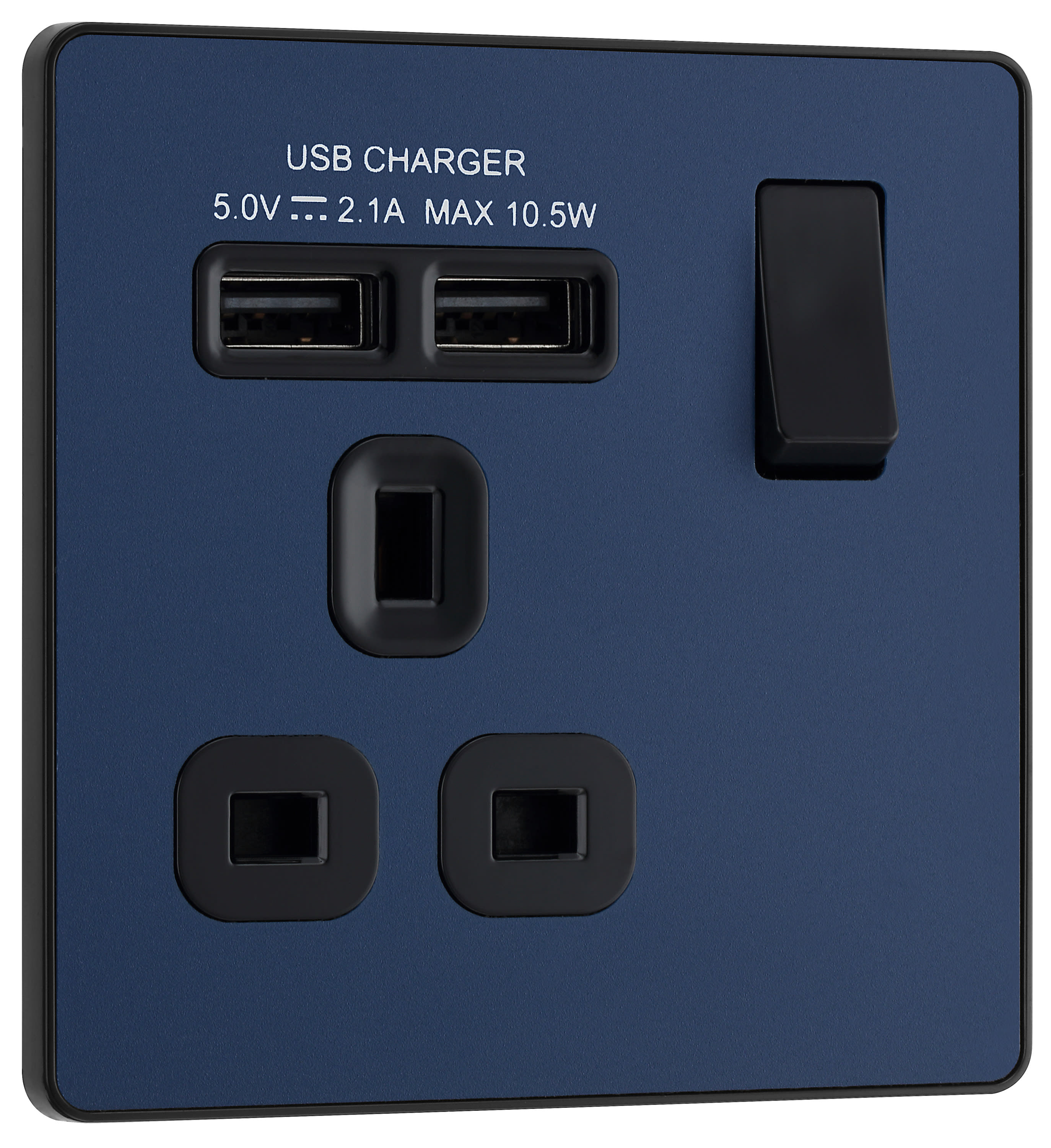 BG Evolve 13A Single Switched Power Socket & 2 x USB (2.1A) - Matt Blue