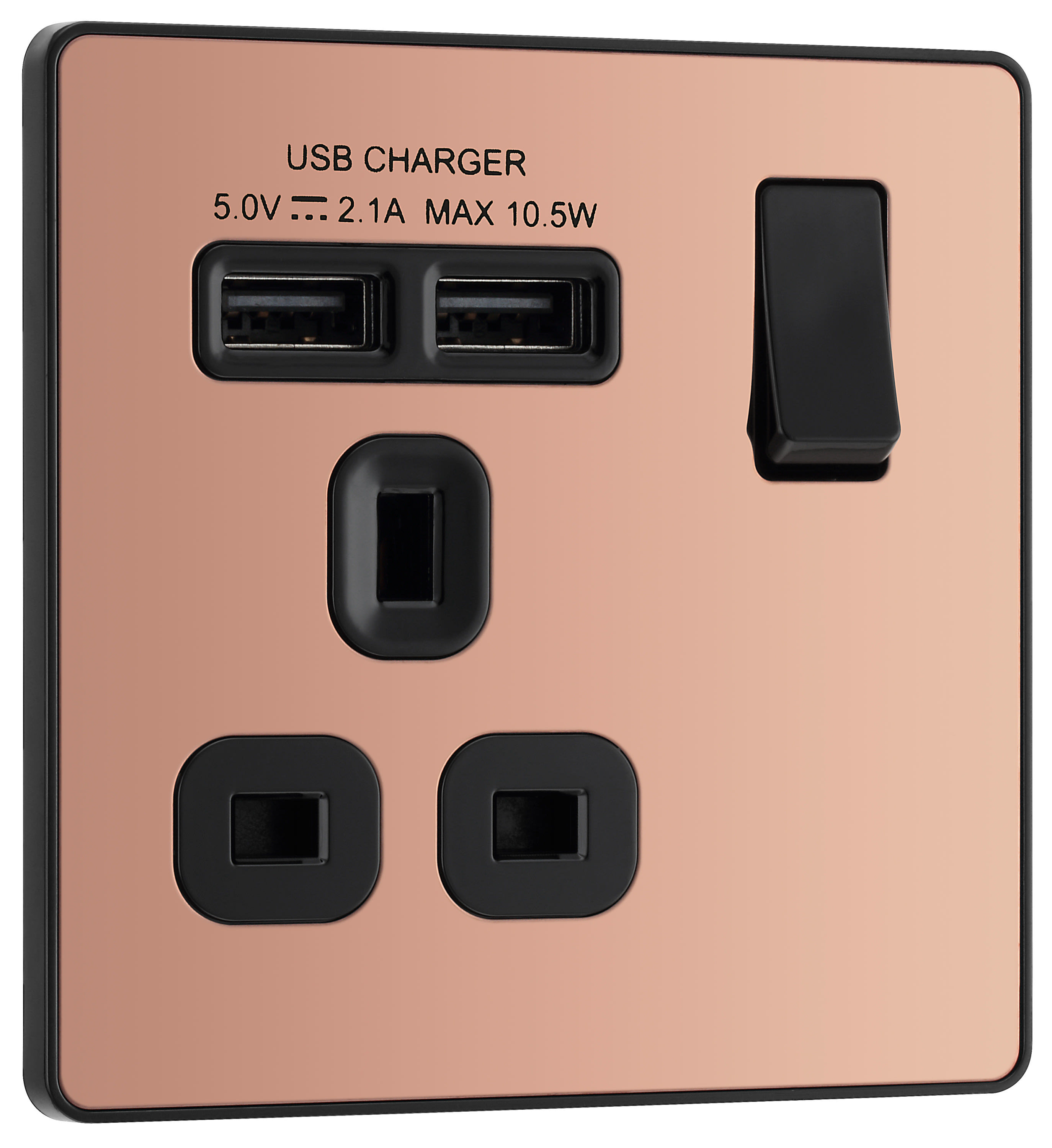 The BG Evolve Single Switched Power Socket comes with two USB charging ports, allowing you to plug in an electrical device and charge mobile devices simultaneously without having to sacrifice a power socket. The socket has a low profile screwless flat plate that clips on and off, making it ideal for modern interiors. The polished copper finish adds a touch of luxury and sophistication to any room, making it a striking focal point in your interior decor.