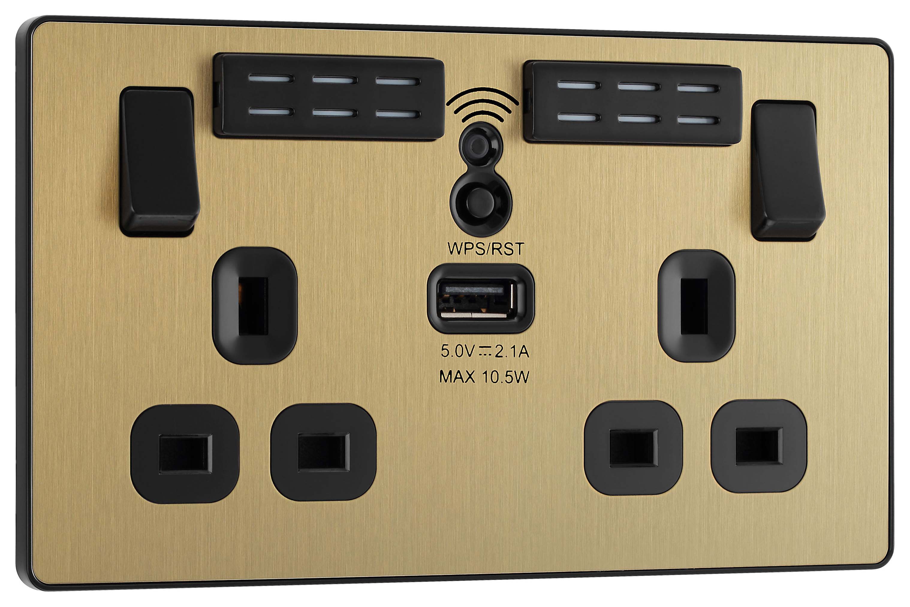 The BG Evolve Wi-Fi Extender Double Switched Power Socket will eliminate dead spots and expand your Wi-Fi coverage. Designed to work with all wireless broadband routers and easy to install with one touch WPS, this includes a USB charging port and eradicates the need for plug in adaptors, keeping sockets free for use. Ideal for retro-fit, simply fit to an existing 25mm back box in the same way you would fit a regular power socket. The Evolve range also features a low profile screwless flat plate that clips on and off, making it ideal for modern interiors. Featuring a sleek brushed brass finish, this switch effortlessly elevates the aesthetic of any room, adding a touch of timeless elegance to your interior design scheme.