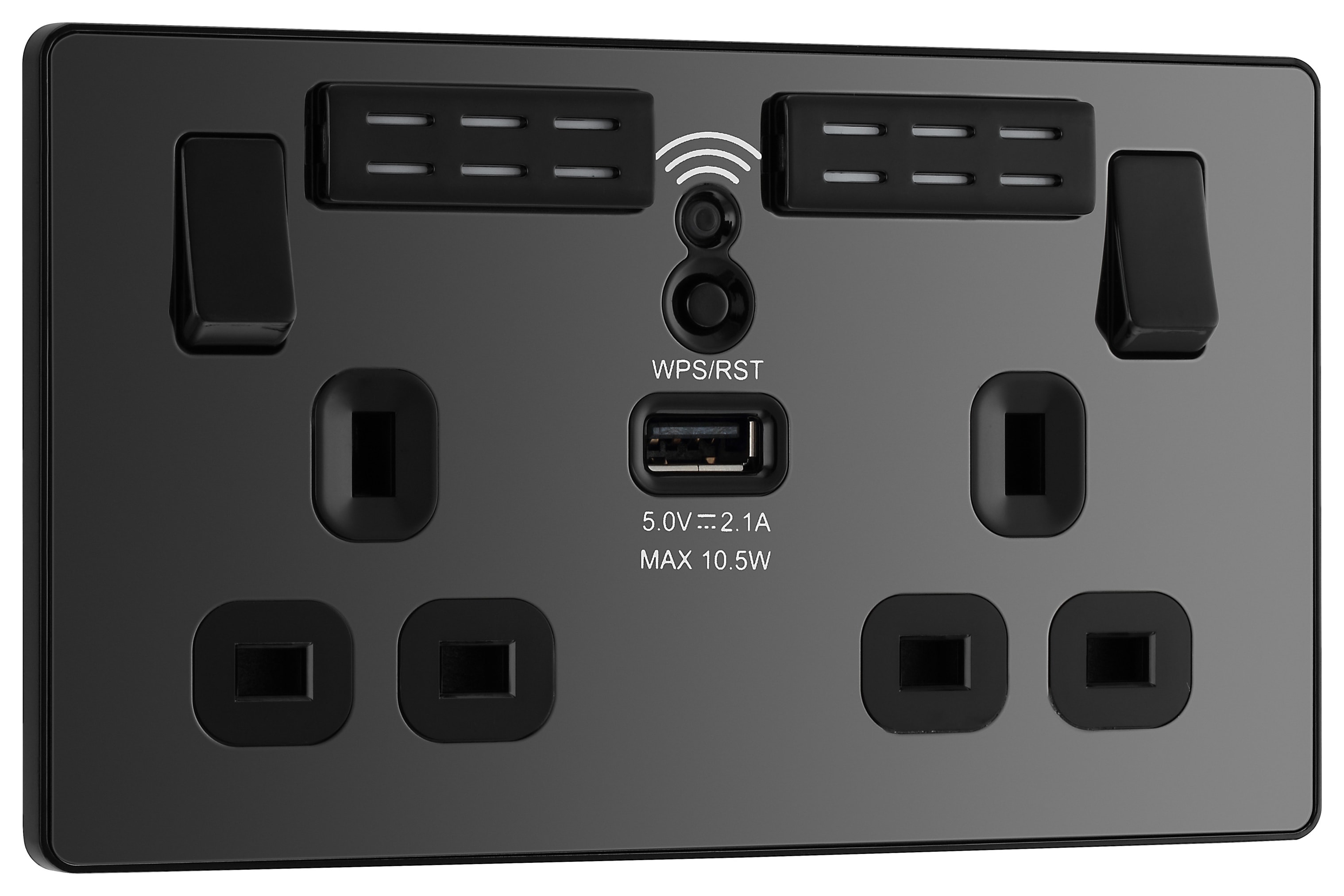 The BG Evolve Wifi Extender Double Switched Power Socket with 1 x USB will eliminate dead spots and expand your WiFi coverage. Designed to work with all wireless broadband routers and easy to install with one touch WPS, this includes a USB charging port and eradicates the need for plug in adaptors, keeping sockets free for use. Ideal for retro-fit, simply fit to an existing 25mm back box in the same way you would fit a regular power socket. The Evolve range also features a low profile screwless flat plate that clips on and off, making it ideal for modern interiors. The black chrome finish adds a touch of sophistication and elegance to any interior decor, elevating the aesthetic appeal of your space while providing essential functionality.