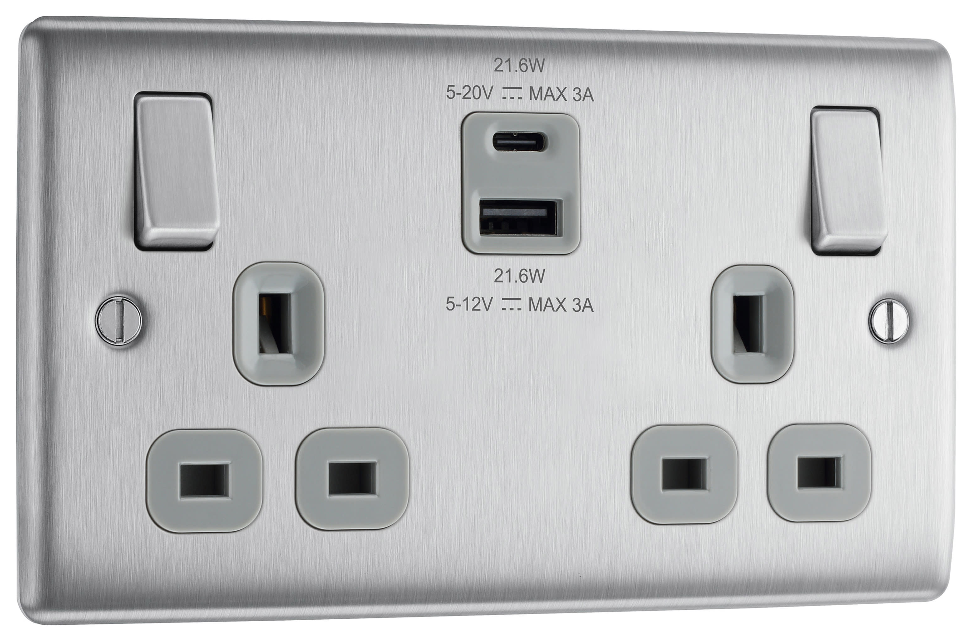 BG Nexus 13A Double Switched Power Socket with USB A&C, 22W - Brushed Steel
