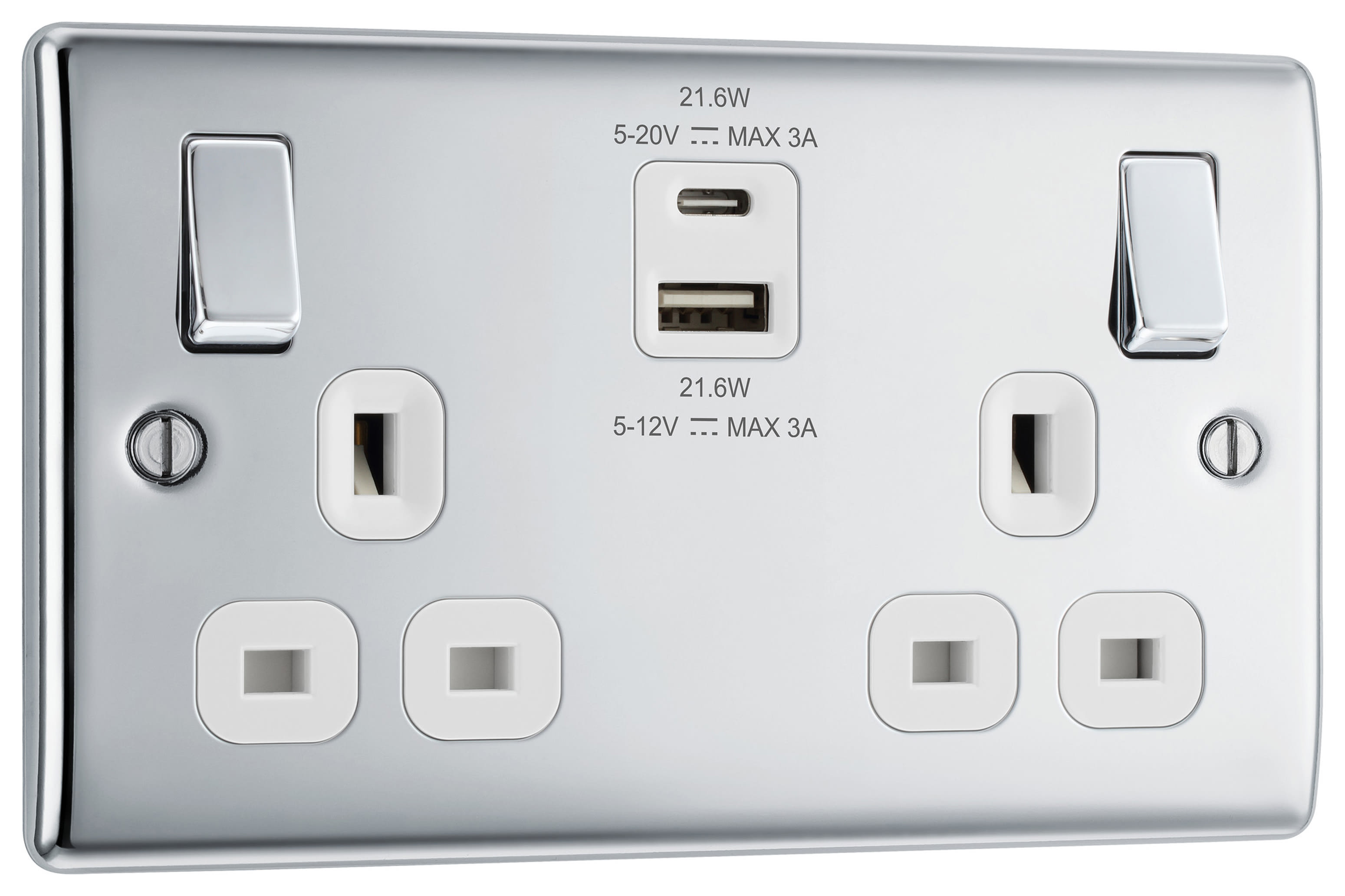 BG Nexus 13A Double Switched Power Socket with USB A&C, 22W - Polished Chrome