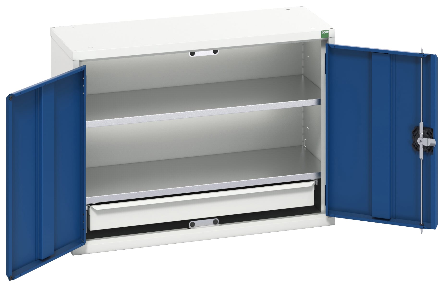 This Bott Verso Economy Cupboard is made from durable steel housing and finished in durable powder coat paint (RAL 7035 light grey and RAL 5010 gentian blue). It has 2 adjustable height, galvanised steel shelves (35kg U.D.L.) and 1 x 75mm drawer (10kg U.D.L.). The cupboard can be fixed onto walls to maximise the use of space in the workplace.