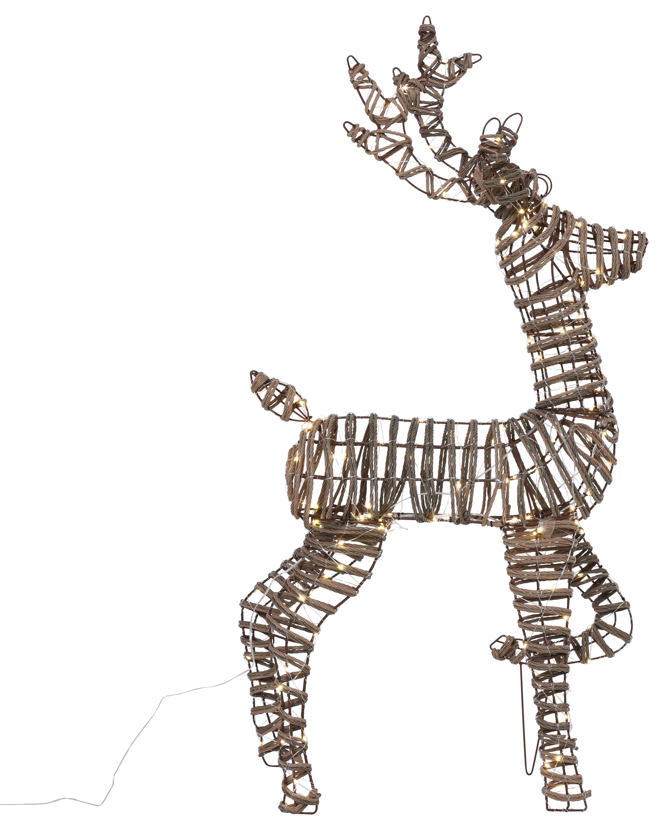 Add a festive sparkle to your home or garden with our large light up Reindeer, a charming addition to your Christmas display that brings warmth and magic to any setting. Crafted from natural-look rattan woven around a brown metal frame, this elegant deer is wrapped in glowing white Micro LED lights, creating a beautifully soft, seasonal glow. Designed for ease and practicality, the reindeer features a built-in timer (8 hours on, 16 hours off), so you can enjoy coming home to a beautifully lit entrance way with no need to switch on or off all season long. It's suitable for both indoor and outdoor use, and comes supplied with miniature cable ties and ground pegs for added stability in your garden. The reindeer can be disassembled if required for stress-free storage. Whether standing proudly on your lawn or adding a whimsical touch indoors, this elegant deer is the perfect way to light up the season.