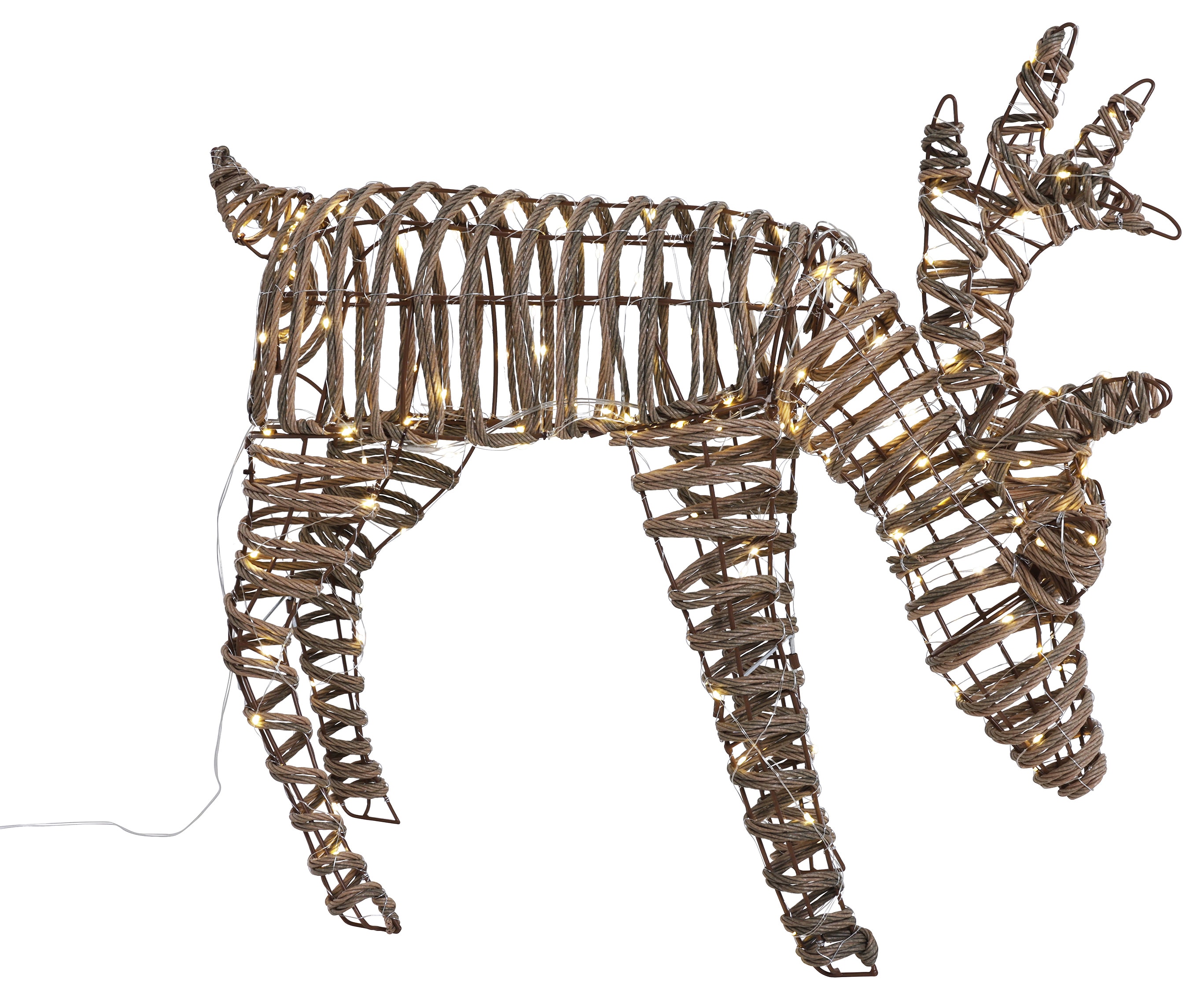 Add a festive sparkle to your home or garden with our small light up Reindeer, a charming addition to your Christmas display that brings warmth and magic to any setting. Crafted from natural-look rattan woven around a brown metal frame, this elegant deer is wrapped in glowing white Micro LED lights, creating a beautifully soft, seasonal glow. Designed for ease and practicality, the reindeer features a built-in timer (8 hours on, 16 hours off), so you can enjoy coming home to a beautifully lit entrance way with no need to switch on or off all season long. It's suitable for both indoor and outdoor use, and comes supplied with miniature cable ties and ground pegs for added stability in your garden. The reindeer can be disassembled if required for stress-free storage. Whether standing proudly on your lawn or adding a whimsical touch indoors, this elegant deer is the perfect way to light up the season.
