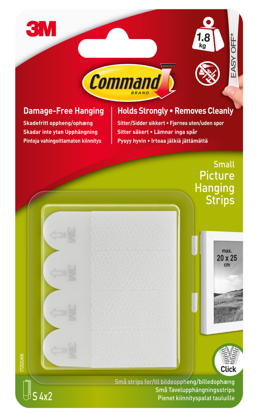 Command Small Picture Hanging Strips are ideal for hanging framed photos and artwork, without causing damage to your walls. Holds weight of up to 1.8kg.
