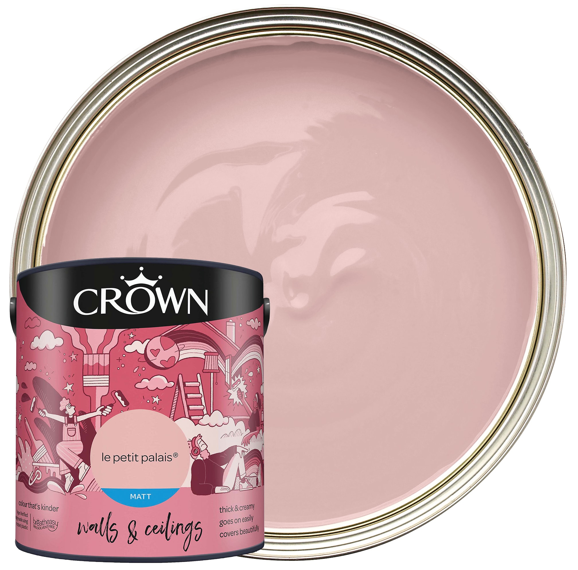 The Crown Matt Emulsion Paint gives your internal walls and ceilings a modern look with no surface shine. This rich and creamy formulation glides on effortlessly for a soft flawless finish. Breatheasy® formulation is 99% solvent free and reduces allergens. This excellent and full coverage paint will look perfect in any room within your home.