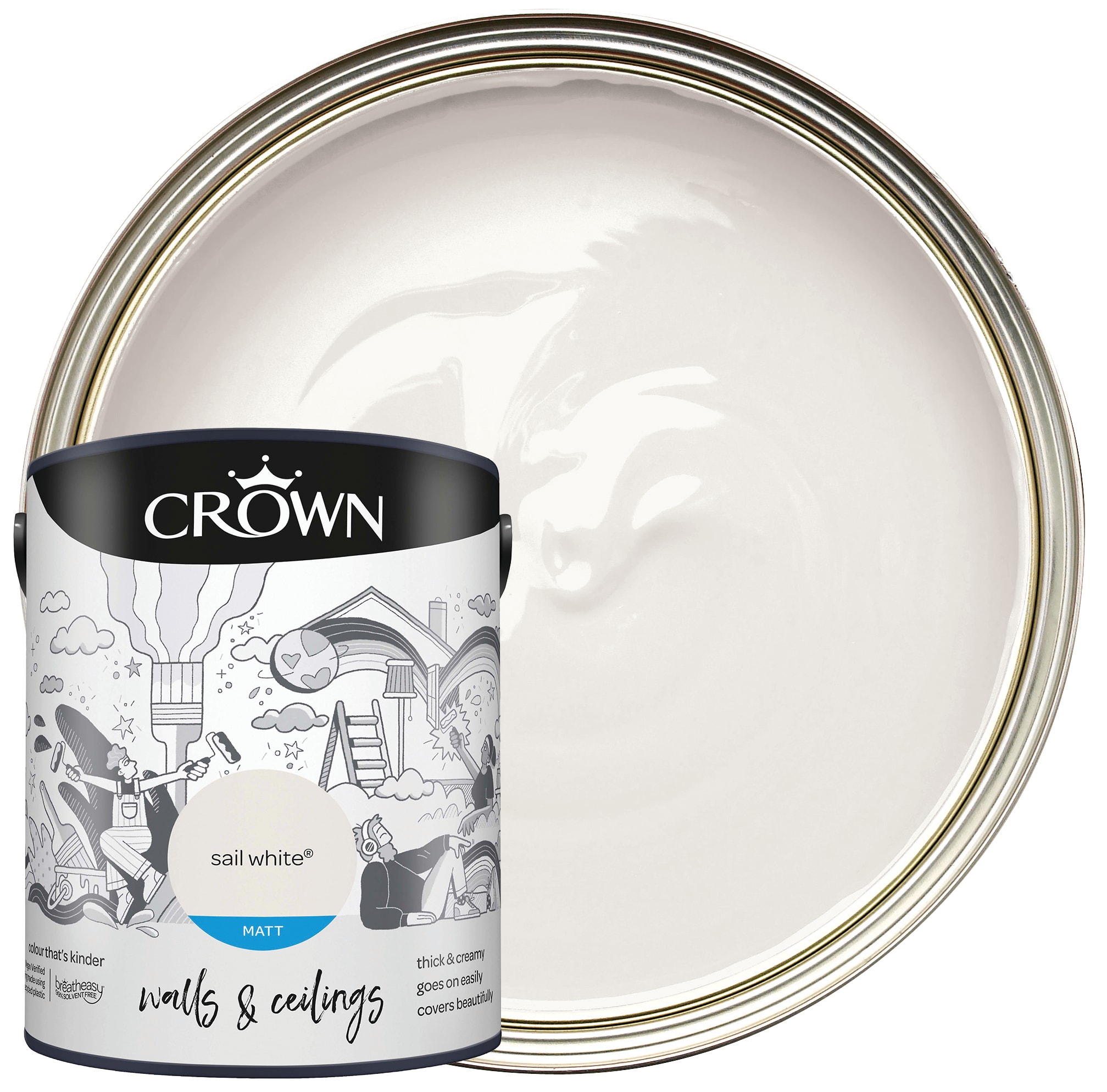 The Crown Matt Emulsion Paint gives your internal walls and ceilings a modern look with no surface shine. This rich and creamy formulation glides on effortlessly for a soft flawless finish. Breatheasy® formulation is 99% solvent free and reduces allergens. This excellent and full coverage paint will look perfect in any room within your home.