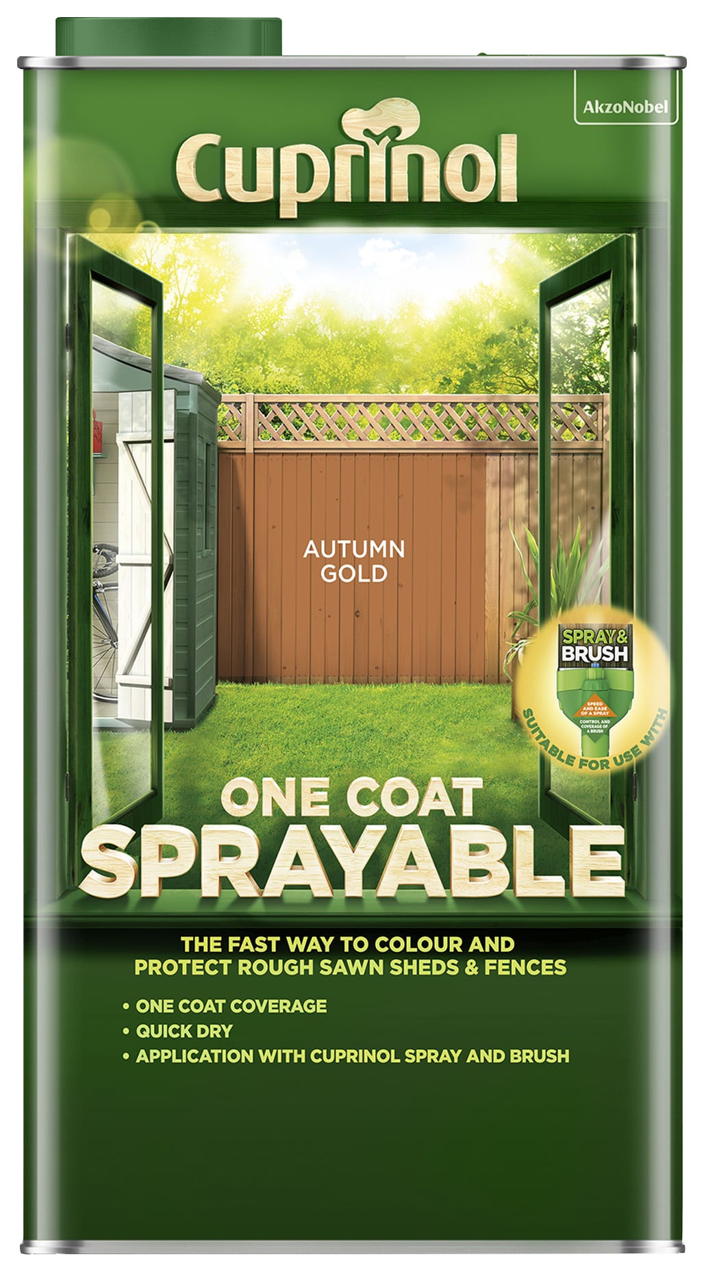 Cuprinol One Coat Sprayable Fence Treatment has been specially formulated to work with the Cuprinol Sprayers to colour and protect rough sawn timber in a fraction of the time. Its special pigments ensure rich colour and even coverage in just one coat. Cuprinol One Coat Sprayable Fence Treatment is quick drying, low odour and safe to use around plants and pets.