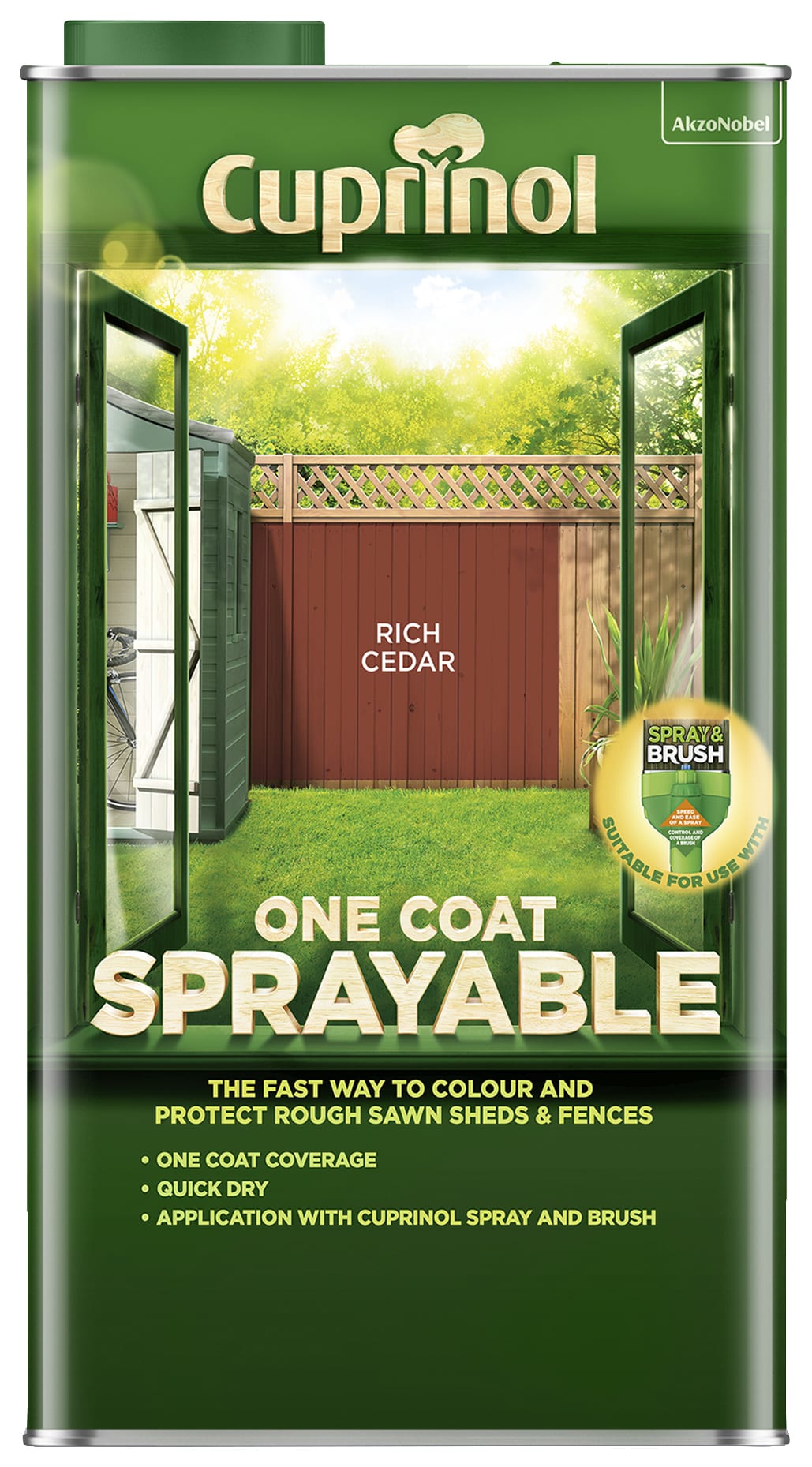 Cuprinol One Coat Sprayable Fence Treatment has been specially formulated to work with the Cuprinol Sprayers to colour and protect rough sawn timber in a fraction of the time. Its special pigments ensure rich colour and even coverage in just one coat. Cuprinol One Coat Sprayable Fence Treatment is quick drying, low odour and safe to use around plants and pets.