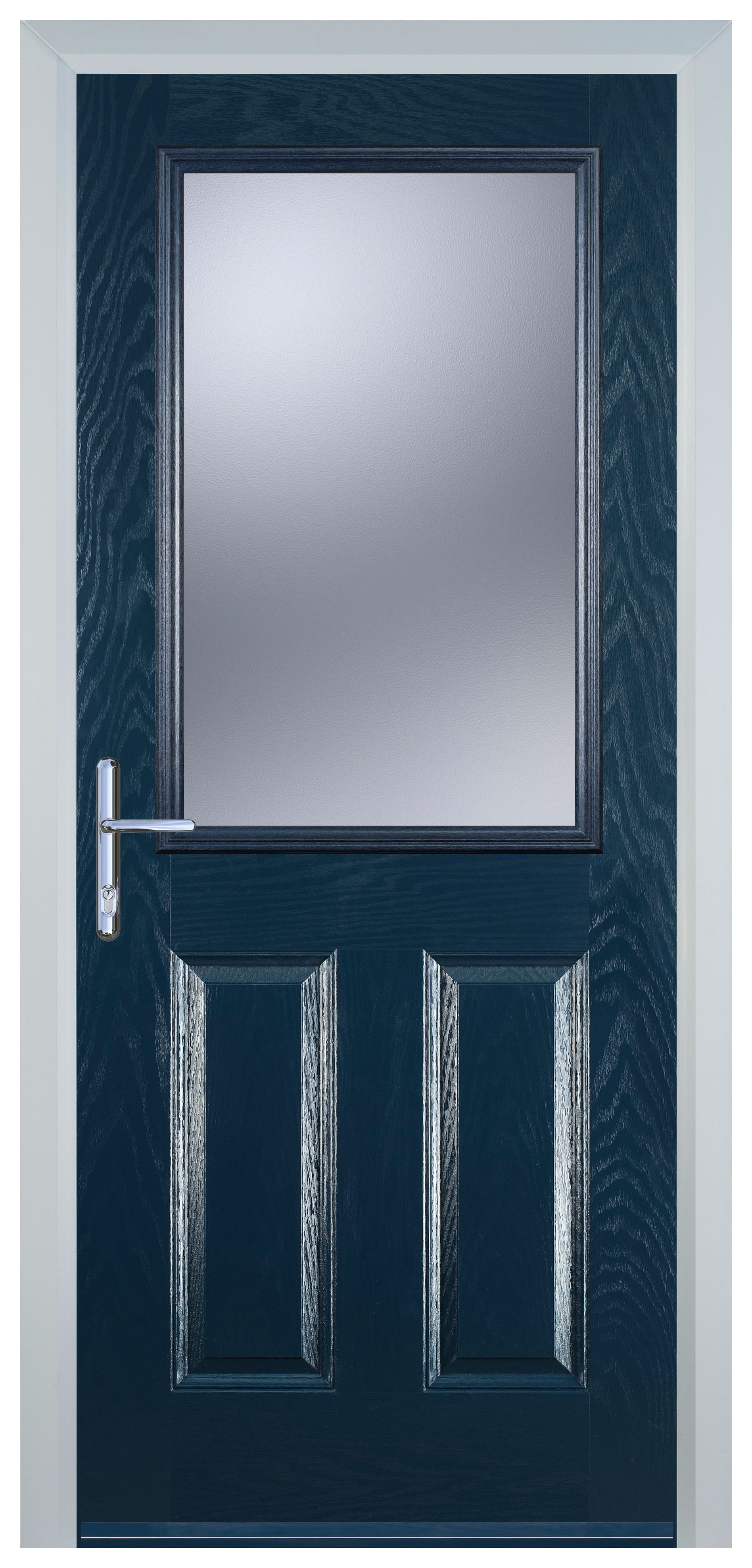 • Door leaf design features a blue external and white internal GRP skin colour, and a single glass panel in a stippolyte glass pattern