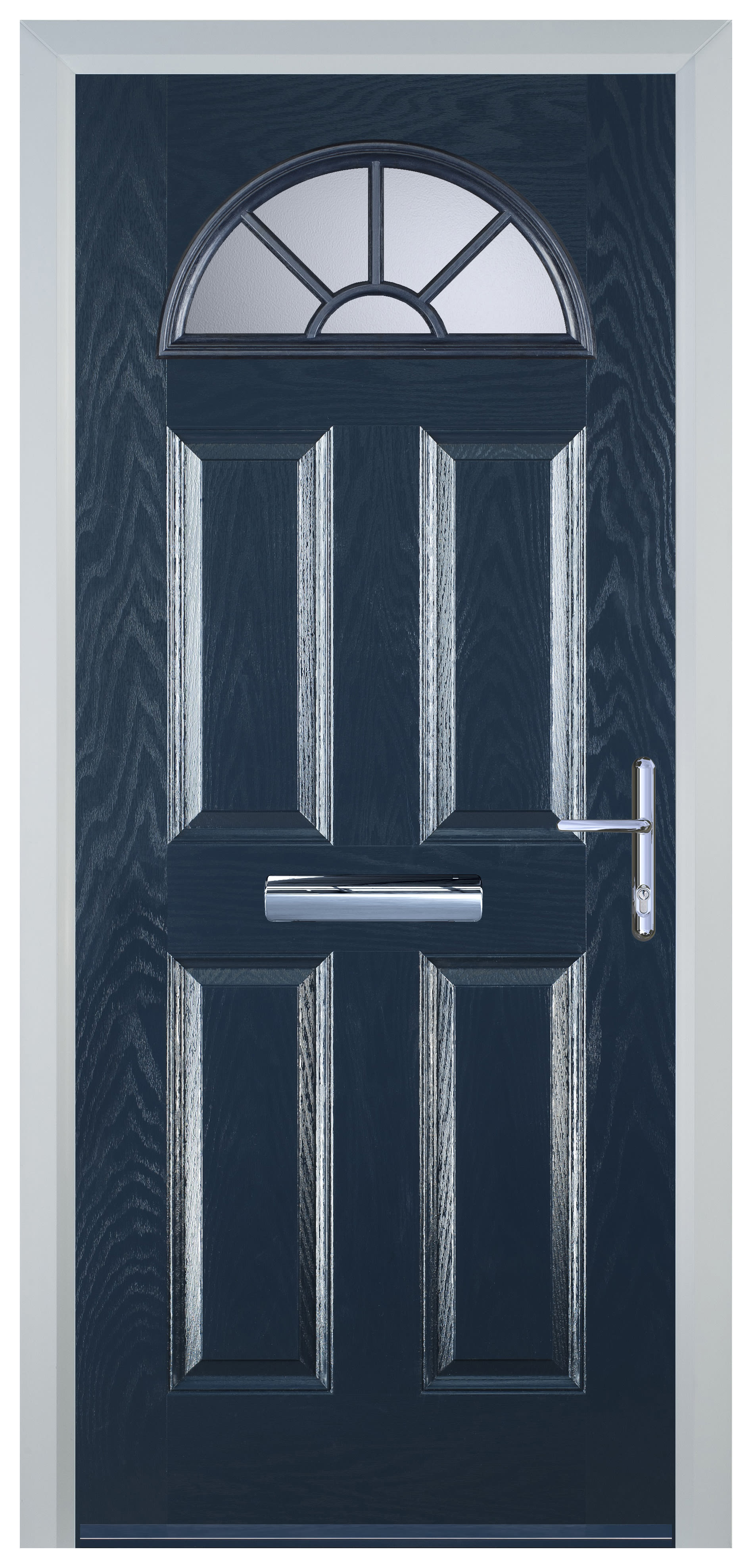 - Door leaf design features a blue external and white internal GRP skin colour, and sunburst arched glazing feature including stippolyte glass pattern