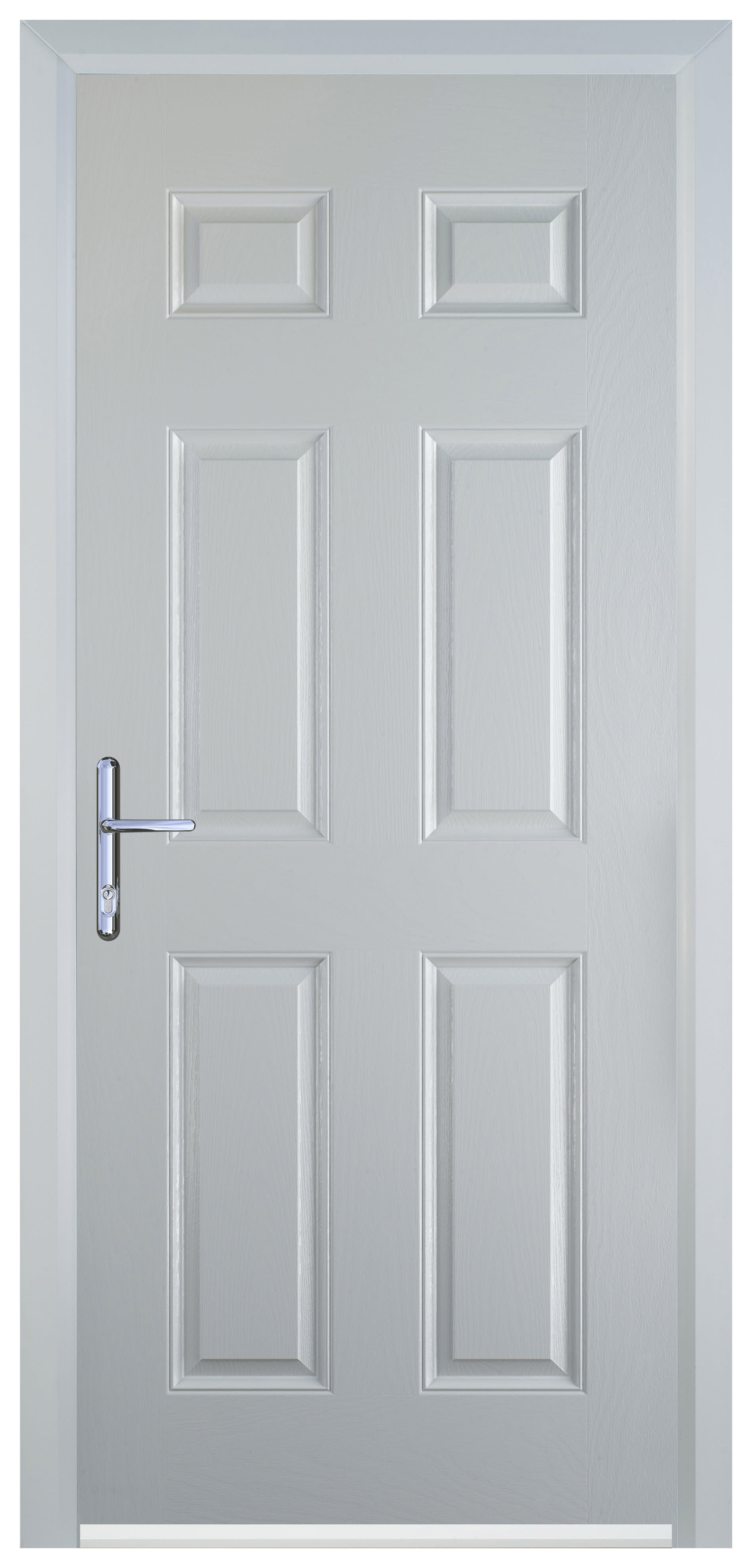 - Door leaf design features a 6 panel white external and internal GRP skin colour, right hand hung in a white veka chamfered uPVC frame