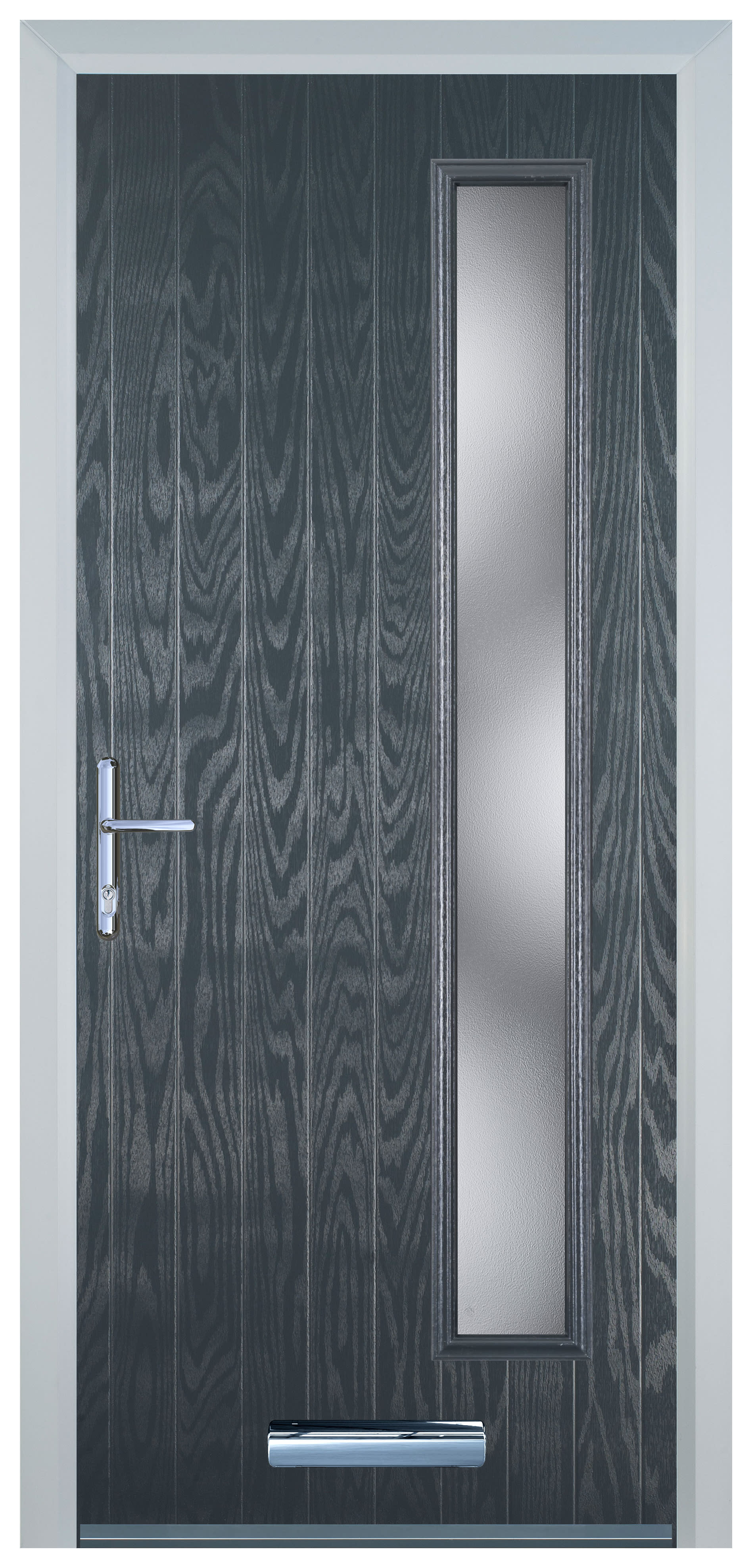 - Door leaf design features an anthracite grey external and white internal GRP skin colour, and a single, long glass panel in a stippolyte glass pattern