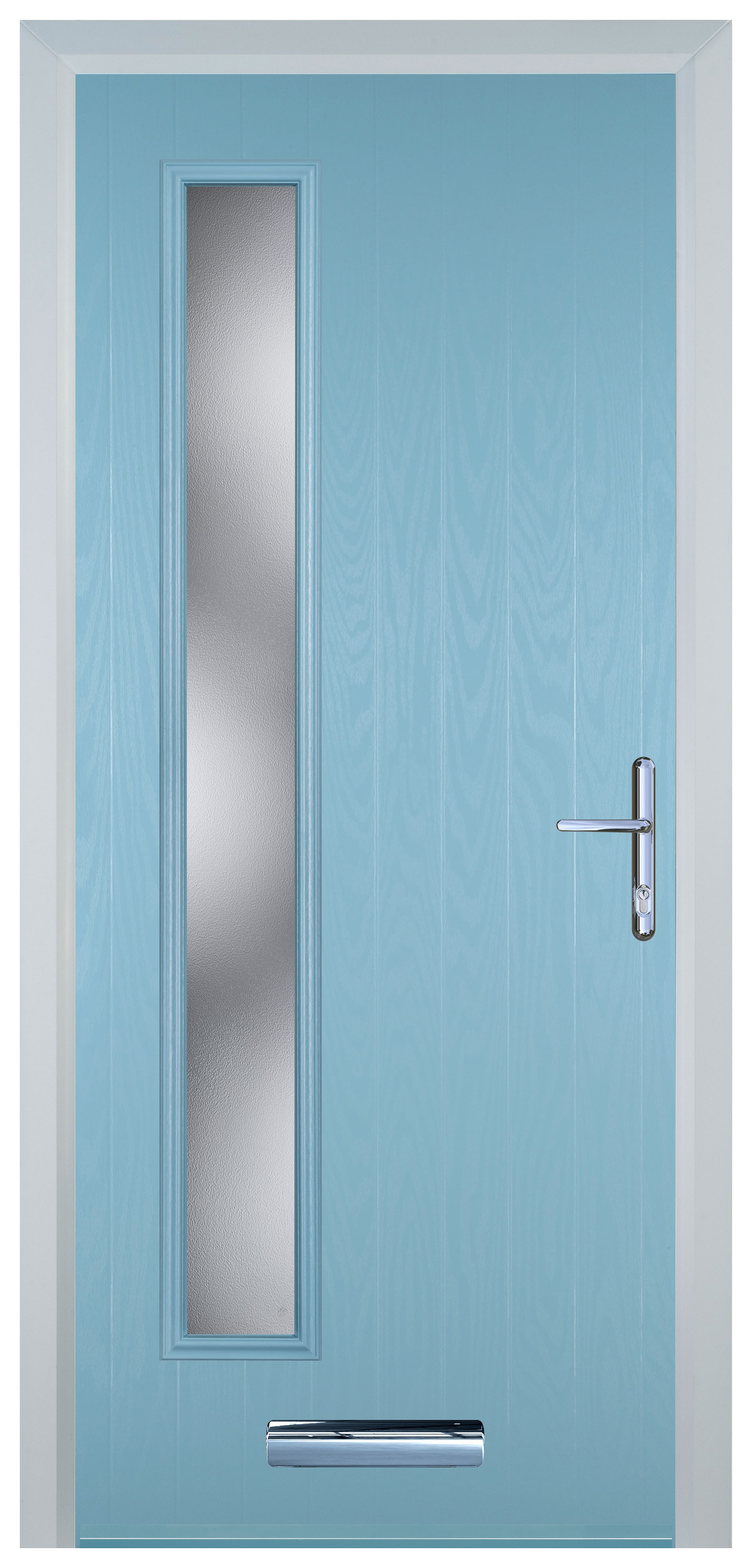 - Door leaf design features a duck egg blue external and white internal GRP skin colour, and a single, long glass panel in a stippolyte glass pattern