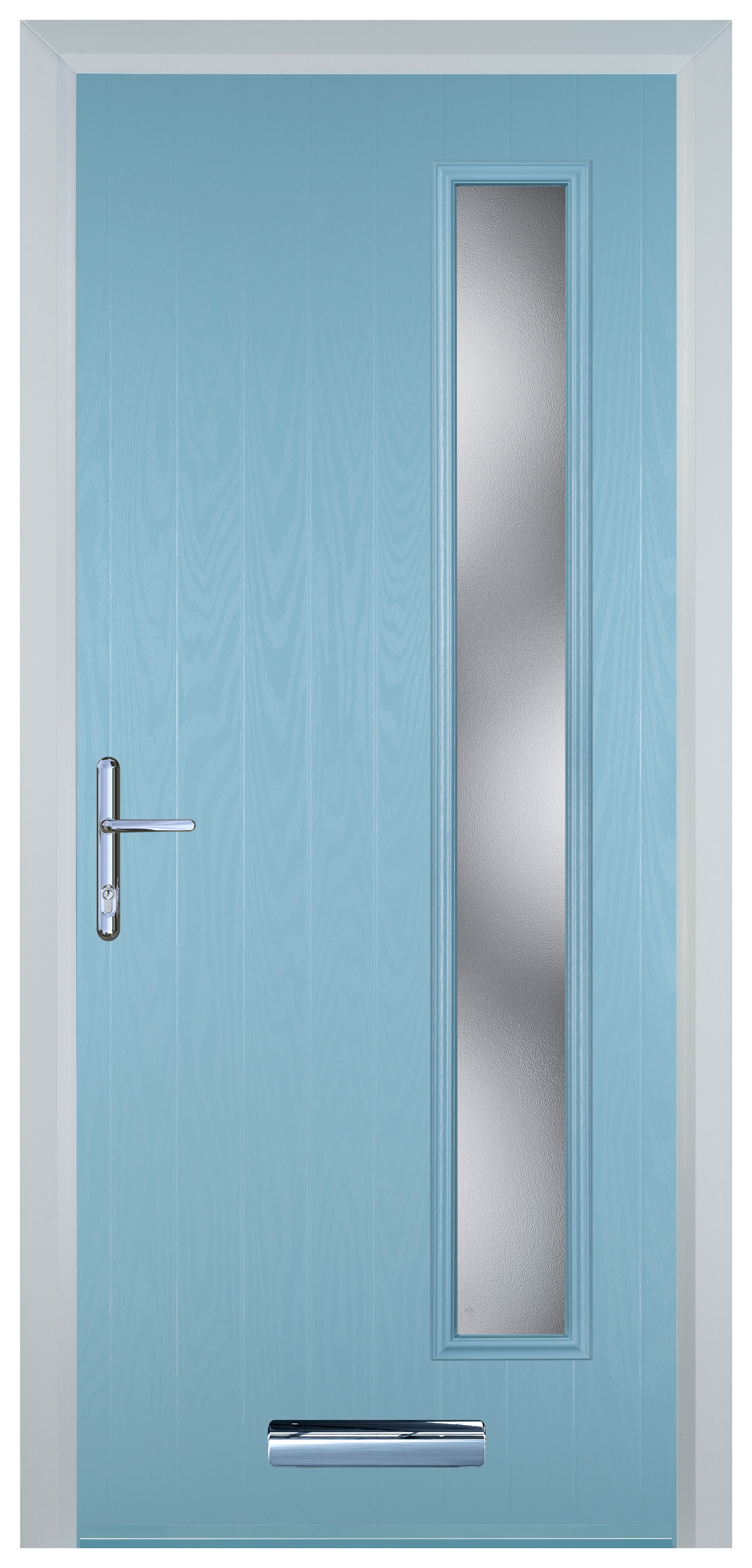- Door leaf design features a duck egg blue external and white internal GRP skin colour, and a single, long glass panel in a stippolyte glass pattern