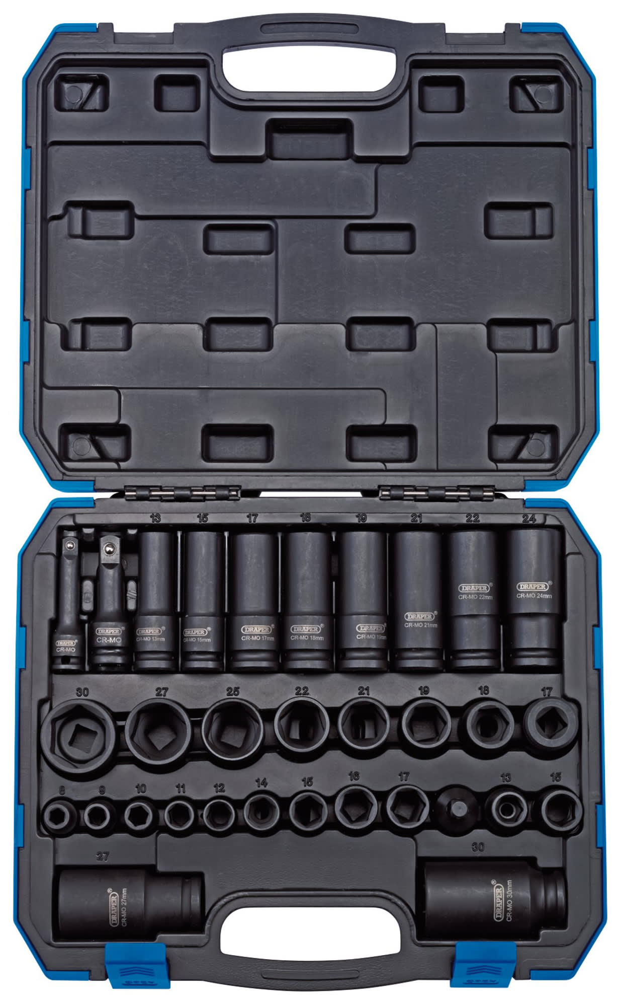 The Draper 3/8" and 1/2" Square Drive Impact Socket Set has sockets forged from chrome molybdenum steel, hardened, tempered and chemically blacked for corrosion protection. Hole for accessory spring loaded ball. Packed in plastic storage case. Includes 9 x 3/8" sockets: 8, 9, 10, 11, 12, 14, 15, 16, 17mm, 10 x 1/2" sockets: 13, 15, 17, 18, 19, 21, 22, 25, 27, 30mm, 10 x 1/2" deep sockets: 13, 15, 17, 18, 19, 21, 22, 24, 27, 30mm, 1 x 1/2" (F) x 3/8" (M) adaptor1 x 3/8" extension bar: 75mm1 x 1/2" extension bar: 75mm. Safety Note: ONLY impact sockets and accessories can be used with air or electric powered wrenches. NEVER use silver chrome vanadium steel sockets which can shatter and cause personal injury.