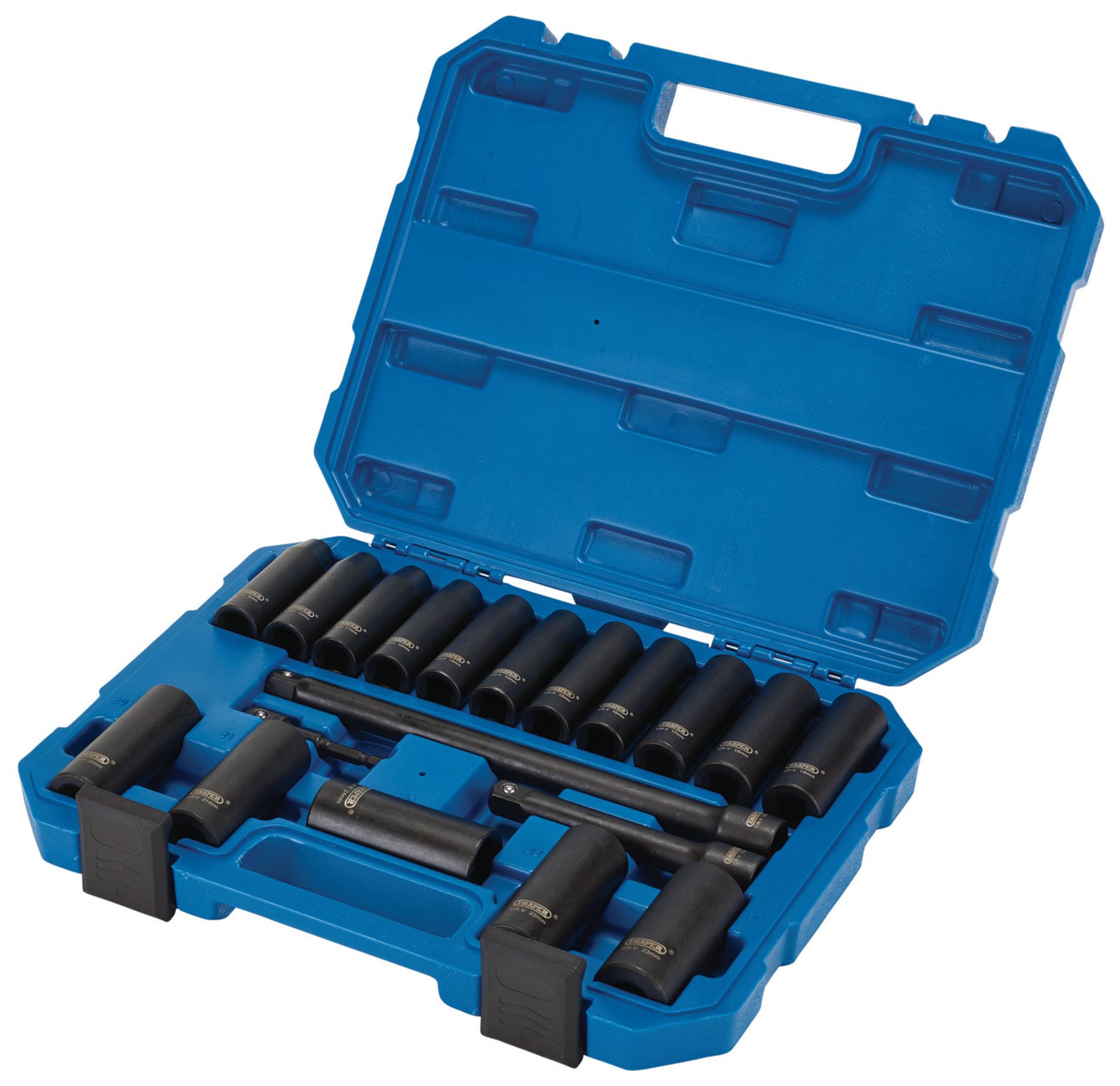 - Set Includes 16 x Draper HI-TORQ® 6-point deep impact sockets, 1/2" square drive: 8, 10, 11, 12, 13, 14, 15, 16, 17, 18, 19, 20, 21, 22, 23, 24mm1 x Impact extension, 125mm, 1/2 square drive, 1 x Impact extension, 250mm, 1/2" square drive, 1 x 1/4" hex to 1/2" socket drive adaptor, 70mm