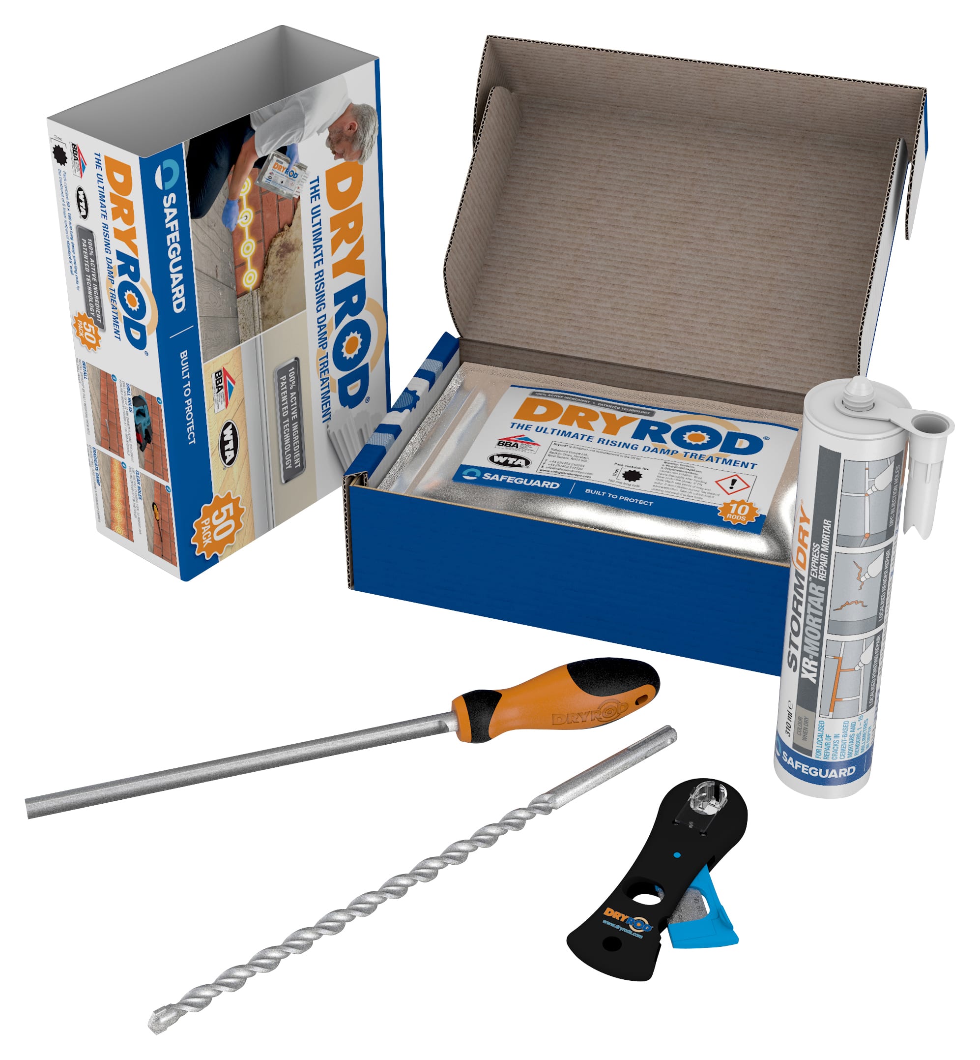 - Kit contains: 1 x (Box of 50) Dryrods, 1 x Dryzone System Hole Clearing Tool, 1 x Dryzone System Rod Cutting Tool, 1 x Dryzone Drill Bit (12mm x 300mm), 1 x Stormdry XR Mortar