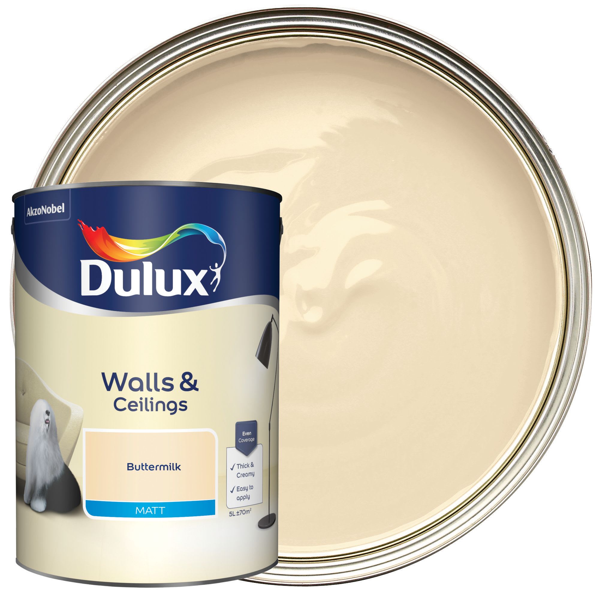 The Dulux Matt Emulsion Paint is a smooth and creamy emulsion paint for use on walls and ceilings which is ideal for a modern, flat finish. Buttermilk is a full bodied, cosy cream, ideal for balancing stronger warm neutrals.