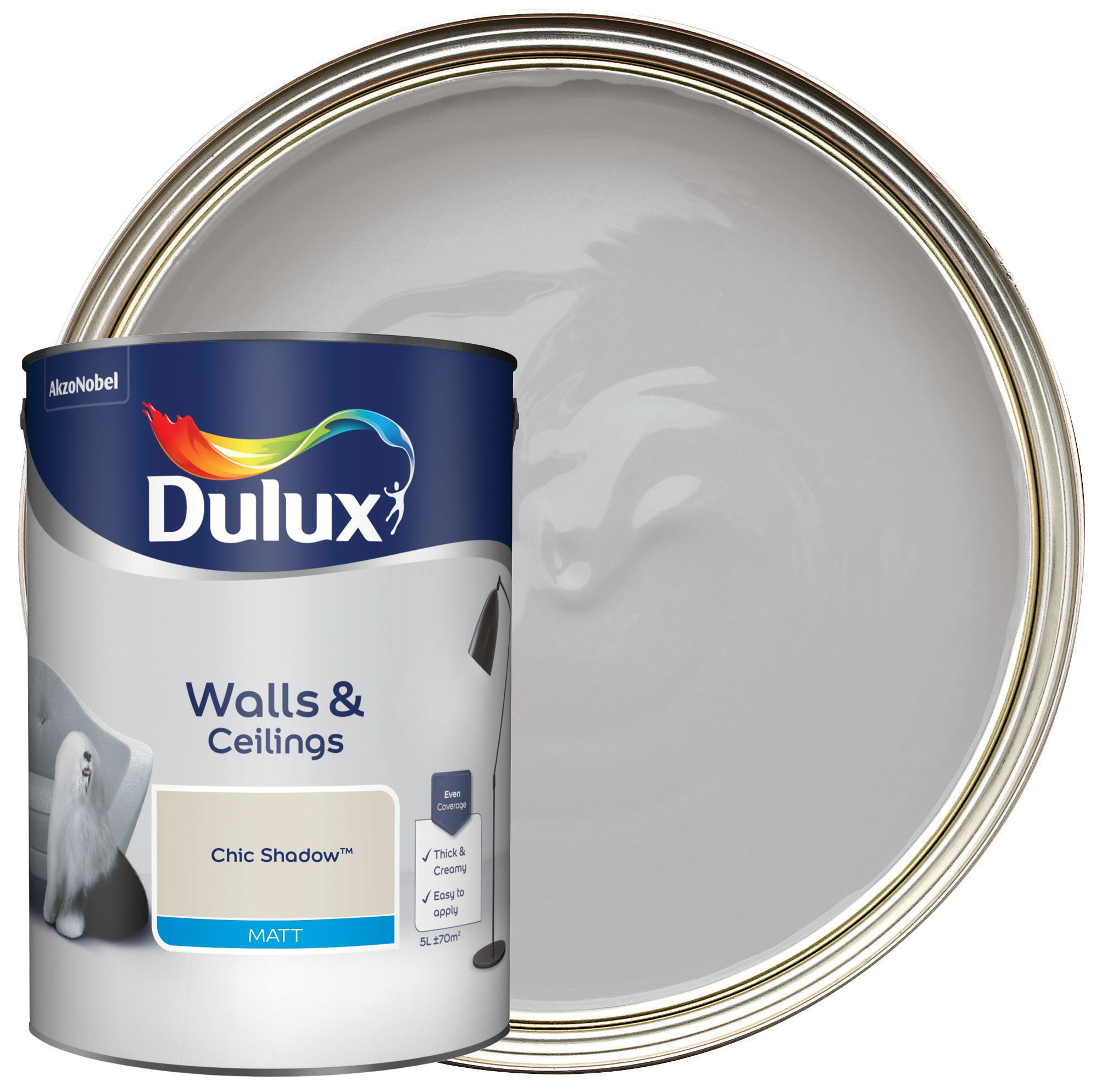 The Dulux Matt Emulsion Paint is a smooth and creamy emulsion paint for use on walls and ceilings which is ideal for a modern, flat finish. Chic Shadow is a mid-tone, pure grey with a little touch of warmth to ensure it is welcoming as well as sleek and modern. Choose this shade if you have good natural light and want to create a cool, neutral room where you will be able to think clearly and unwind.