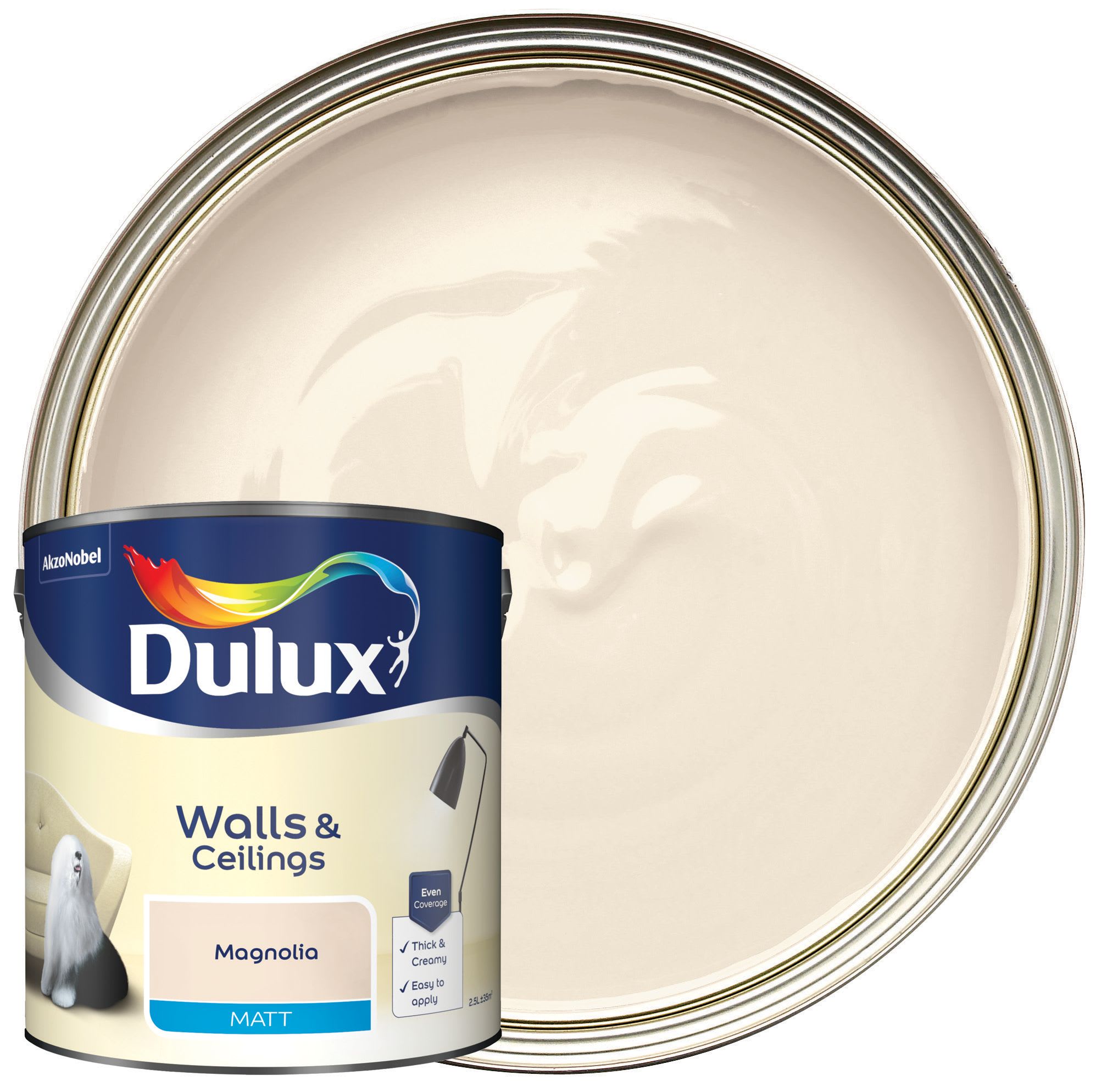 The Dulux Matt Emulsion Paint is a smooth and creamy emulsion paint for use on walls and ceilings which is ideal for a modern, flat finish. Magnolia is a classic white with a slightly peachy undertone.