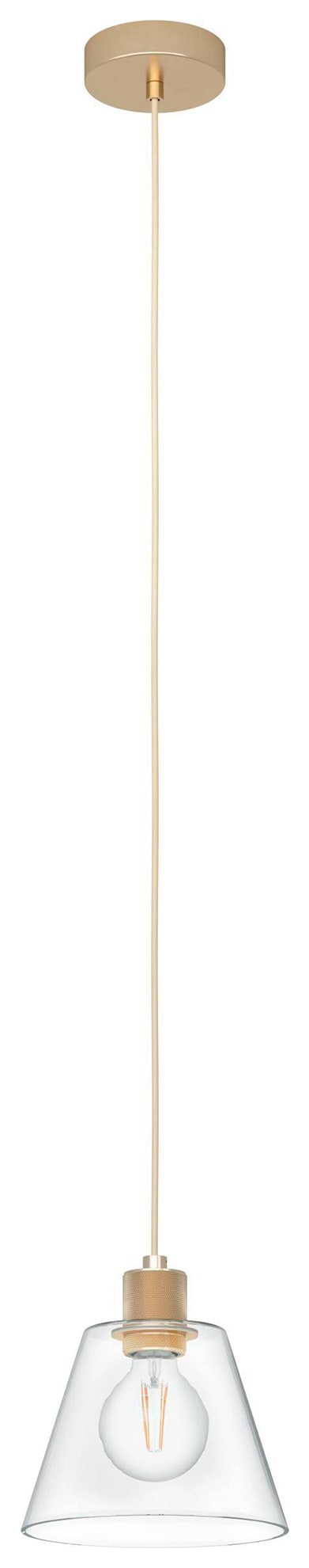 The Copley single pendant light from Eglo features a decorative gold-coloured metal lamp holder with a conical-shaped glass lampshade and a visible lightbulb design. The lighting fixture has a gold lamp holder and ceiling mount, adding a touch of sophistication to the stylish pendant light. This pendant light blends seamlessly into modern interiors and offers beautiful lighting for the living or dining room. The product requires an E27 lightbulb, which is not included.