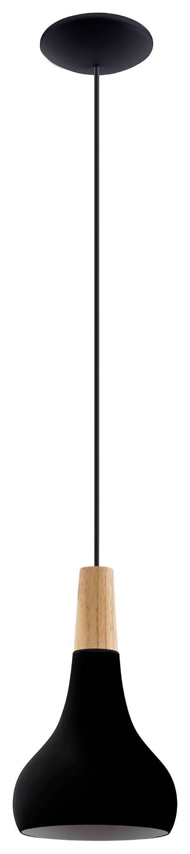 The Sabinar single pendant light from Eglo features a curved black metal lampshade suspended on a black cable. The lampshade has a brown wooden element that complements the light’s distinctive charm. With its Scandinavian design and diameter of 18cm, the pendant light provides stylish lighting in the living or dining room. The product has an E27 lamp holder and requires 1 x E27 lightbulb, which is not included.