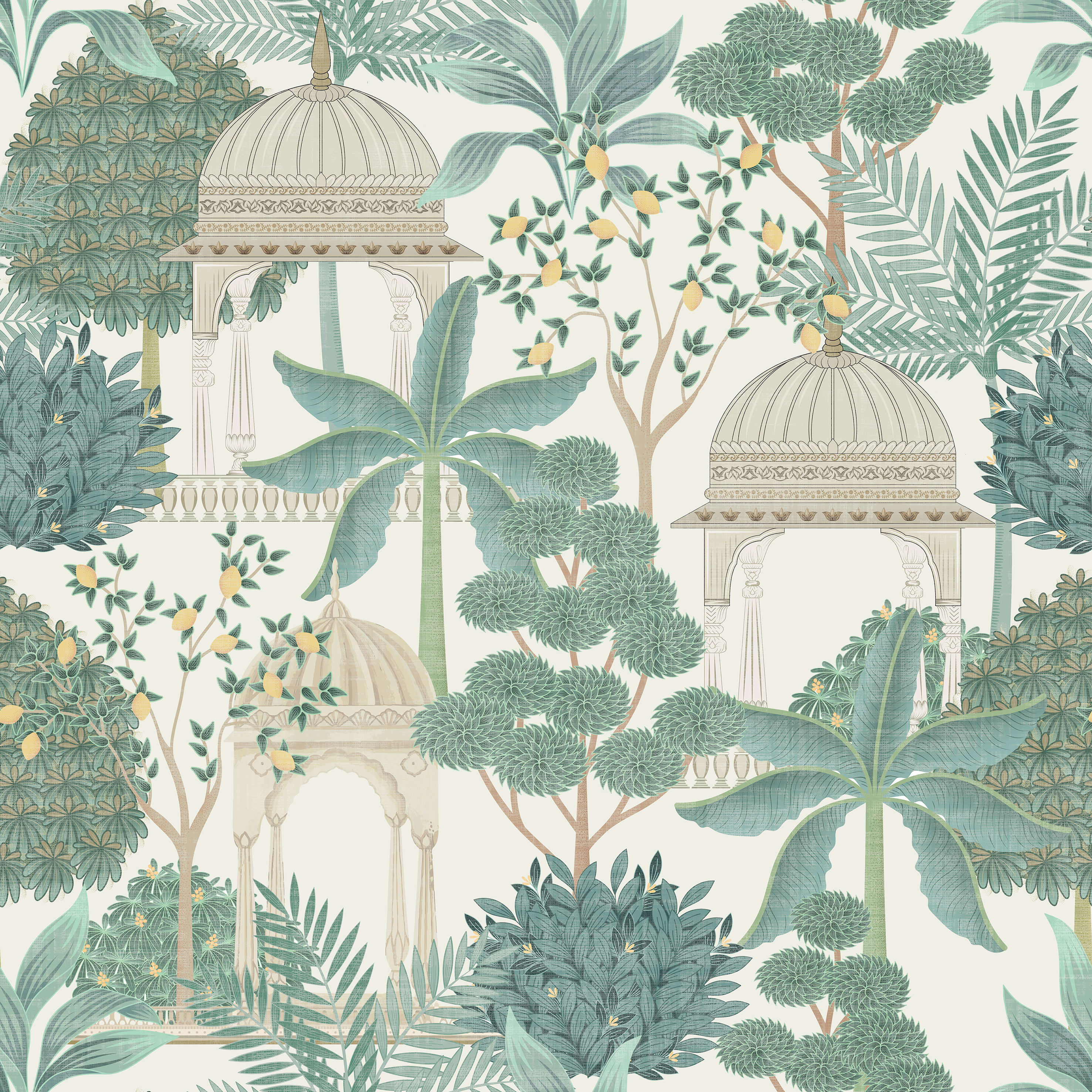 Step through the gateway to tranquillity with our enchanting new wallpaper Exotic Pavilion. Inspired by the lush havens of South Asia, this design transports you to a far-off world of fragrant lemon groves, swaying palms and exotic flora. The design captures the essence of these mystical gardens with intricately carved pavilions and beautifully hand-drawn tropical foliage, you can almost smell the sweet scent of jasmine and cardamom floating on the breeze. The soft neutral background along with its intricate yet airy design makes it suitable for both spacious and cosy settings, blending seamlessly with modern, traditional, or eclectic decor.
