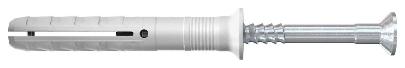 Fischer Hammerfix N-S with countersunk head consists of a high-quality nylon plug and a zinc-plated nail screw. These are already pre-fitted for quick assembly. The Hammerfix is led through the component in the time-saving through-type installation. When driving in the nail screw, the fixing sleeve expands and anchors itself securely in the building material. The fischer Hammerfix N-S with countersunk head is ideal for fixing timber constructions in all building materials in internal areas.