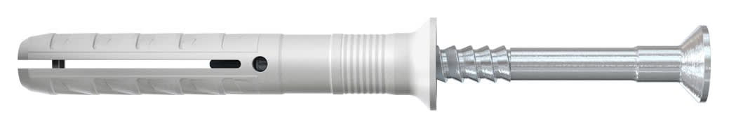 Fischer Hammerfix N-S with countersunk head consists of a high-quality nylon plug and a zinc-plated nail screw. These are already pre-fitted for quick assembly. The Hammerfix is led through the component in the time-saving through-type installation. When driving in the nail screw, the fixing sleeve expands and anchors itself securely in the building material. The fischer Hammerfix N-S with countersunk head is ideal for fixing timber constructions in all building materials in internal areas.