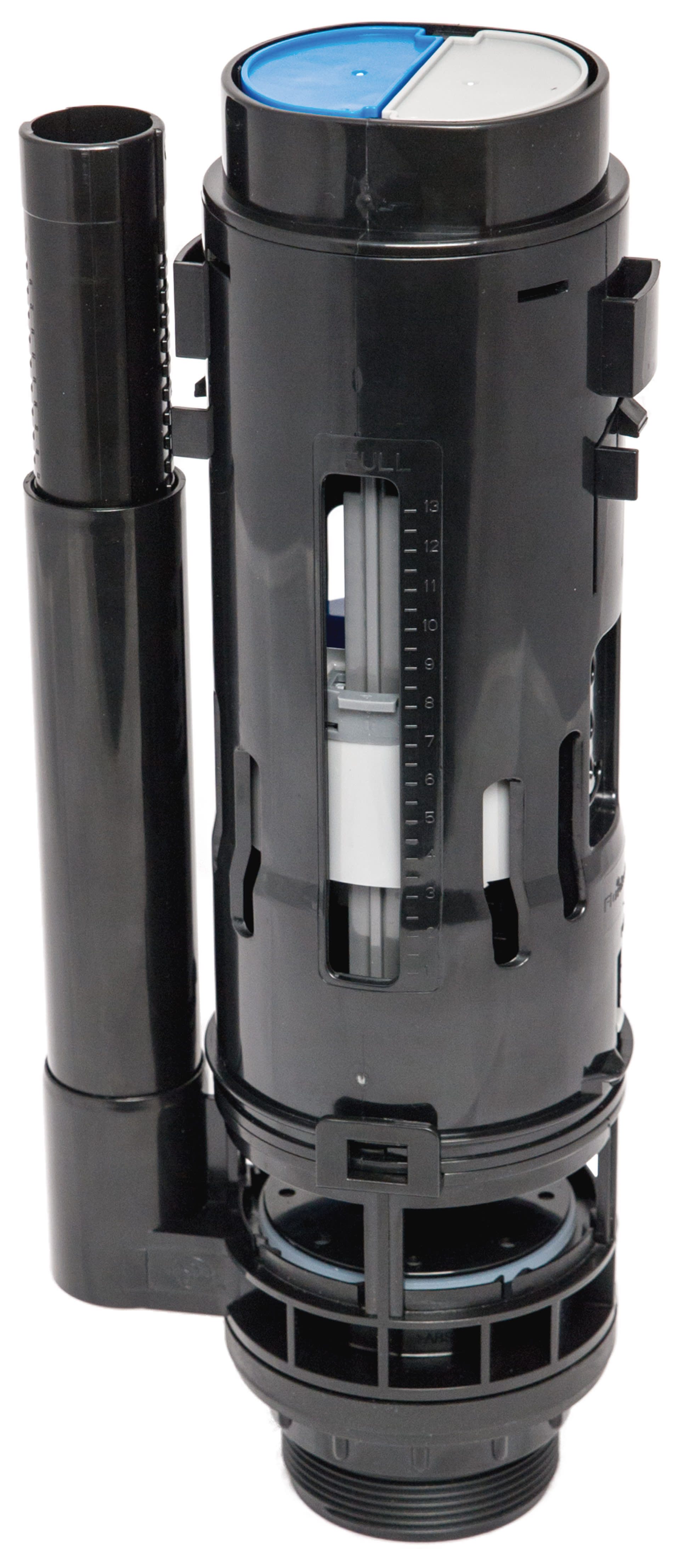 Fluidmaster Mechanical Dual Flush Valve is compatible with virtually all top-button activated cisterns with a 2" outlet. Its dual flush design offers adjustable volumes for both full and partial flushes, while the overflow and rod lengths are also adjustable. A twist-and-release mechanism simplifies maintenance, and silicone seals ensure long-lasting durability.