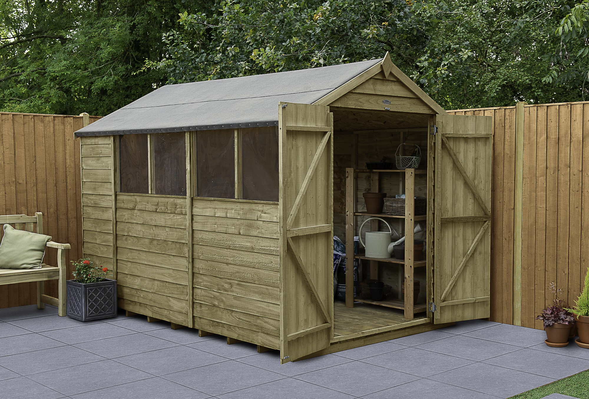 The Forest Garden Apex Overlap Pressure Treated Double Door Shed is a great value way of adding a large, versatile working area to your outdoor space. This shed offers a wide range of solutions from simple garden storage to a larger workshop space. This attractive looking building features a 10ft wide front which gives plenty of space for storage or for lining the sides and back with shelves and workbenches whilst still having enough space left to move around. The garden building features increased framing and a metal roof truss brackets for additional strength. Access in and out of the shed is maximised with large double doors that are braced with double 'Z' framing for added strength and feature hidden hinges for increased security. The hasp and plate door fastening can be secured with a padlock (not included). The solid timber floor allows for the storage of heavier items such as shelving, work benches and large lawnmowers, as well as garden tools and equipment. With 6 fixed windows this shed lets in lots of natural light. This flexible shed is made up of modular sections where same size panels are interchangeable, this means you can position the window panels either side of the shed. You can also move the window panels forward or backwards.