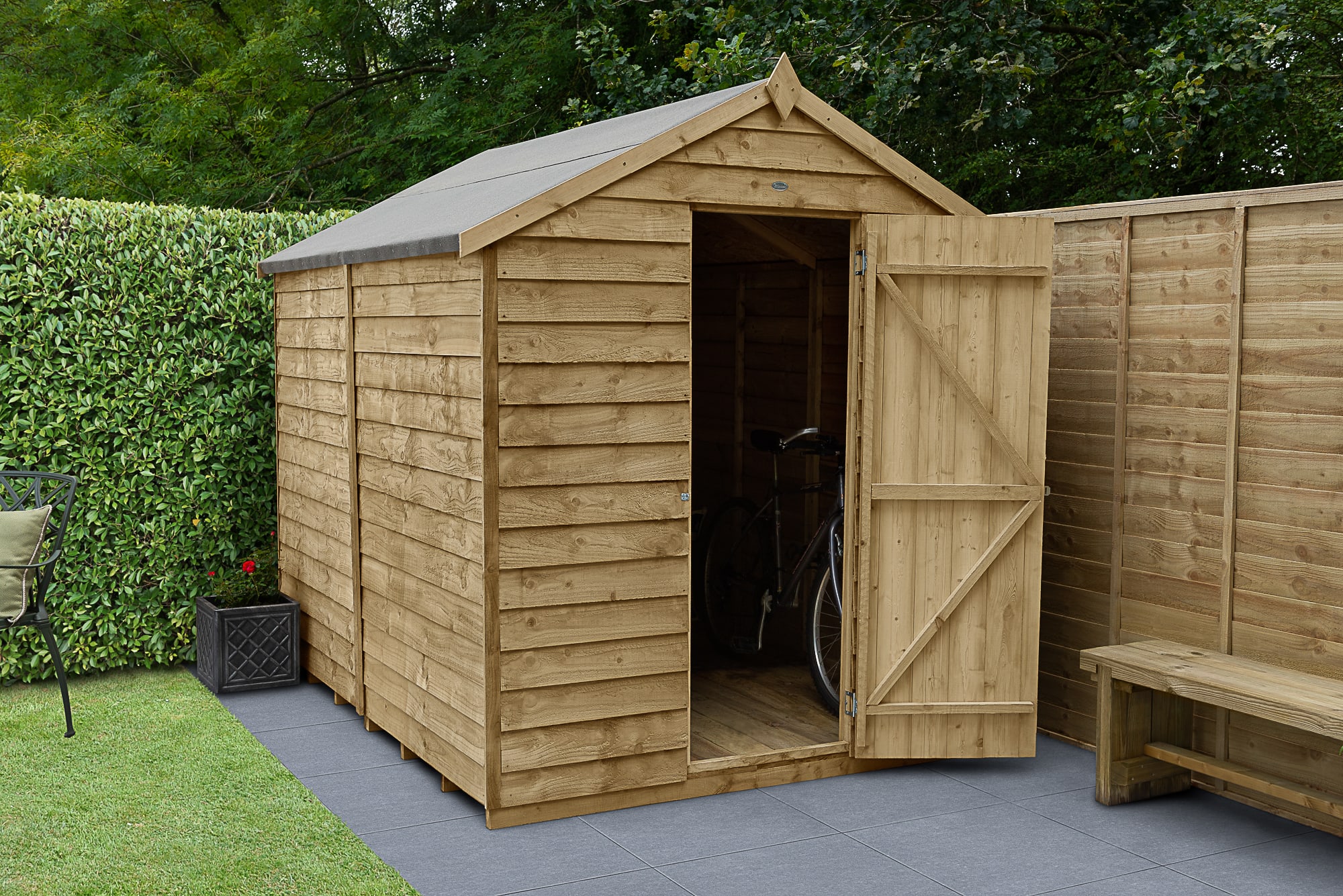 The Overlap Pressure Treated 8 x 6ft Apex Shed with No Windows from Forest has a practical and traditional design and is built to last. It will help keep your garden clutter free and offers a secure space for you to store garden equipment, the Pressure Treated solid timber floor allows for storage of heavier items such as lawnmowers or bags of compost. The shed's improved design features smaller sections, making it easier to handle and easy to assemble. The shed is made using straight cut boards that are overlapped during construction, which aids water run-off and allows for natural movement of the timber so it can adapt to the changing weather conditions. The roof is finished with black sand felt, smooth-planed barge boards and a finial for a decorative touch. With increased timber, these are the best overlap sheds we've ever made. This building is designed with strength and security in mind, with its main feature being the lack of windows to make sure your belongings are not on show. The building features increased framing and an additional metal roof truss bracket for strength. The door is braced with strong double “Z” framing, has secure hidden hinges and is fitted with a hasp and staple latch that can be used with your own padlock. It can be hinged either side of the opening to suit your garden. These quality garden sheds are manufactured in the UK with responsibly sourced timber and the smooth-planed barge board and finial give an attractive finish. The Pressure Treatment of this shed gives it a guarantee against rot for 25 years. All fixtures, fittings and felt needed to build this shed are included, along with easy to follow instructions. This shed comes with a 8 x 6ft base.