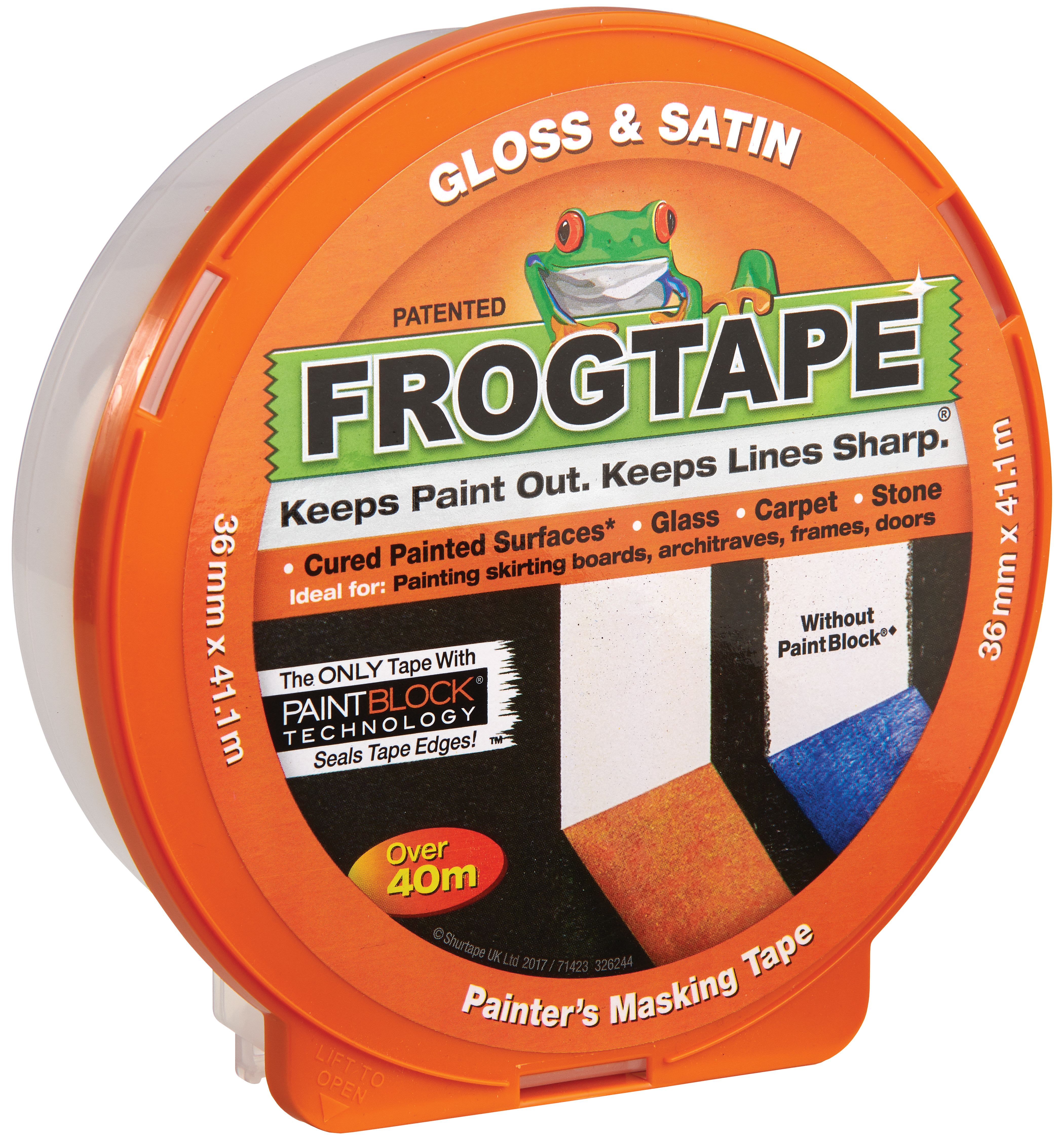 FrogTape Painter’s Masking Tape gives the best finish possible, by keeping paint out and lines sharp. It is the only tape with PaintBlock Technology. The tape can be used when pointing skirting boards, architrave, frames and doors. Perfect on cured painted surfaces, glass, carpet and stone. Designed for use with gloss and satin paints. Remove FrogTape immediately after painting.