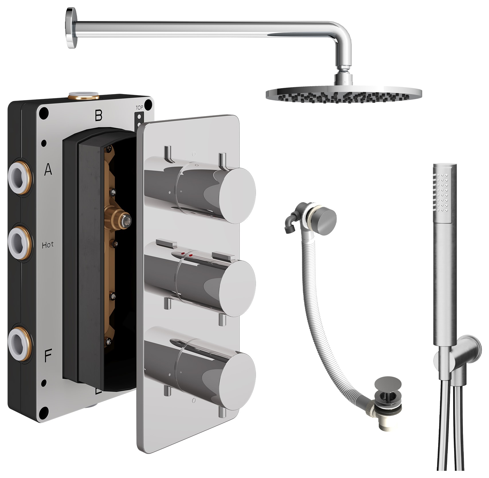 - 3 outlet shower valve, fixed round shower head, wall arm, shower handset and bath waste