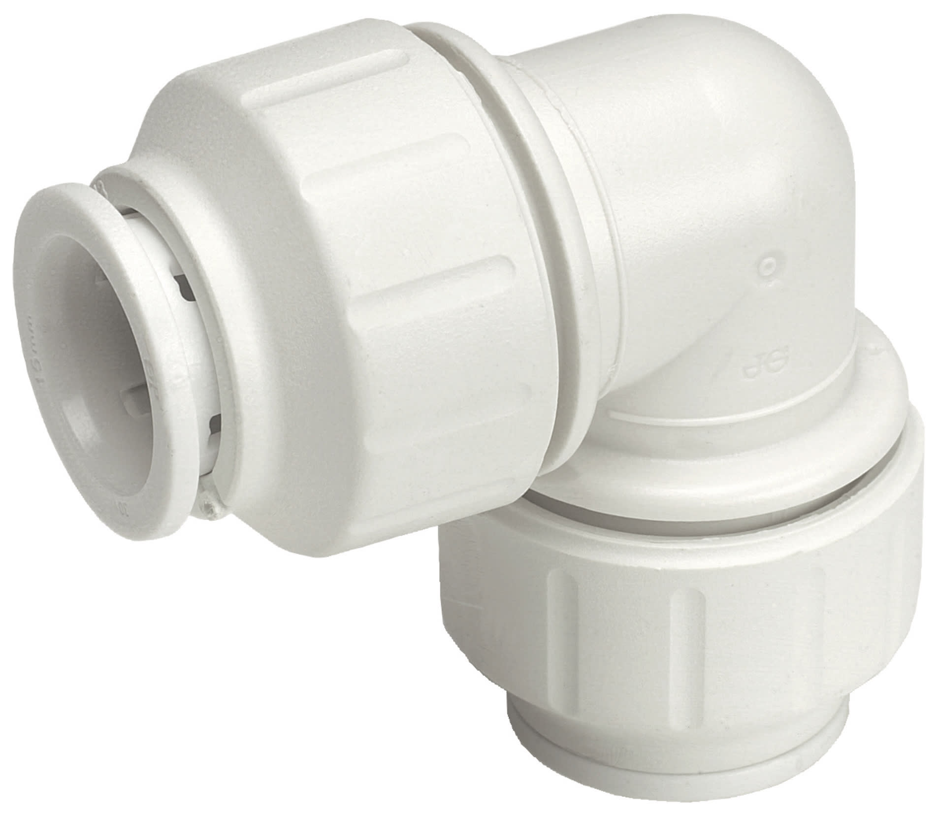 JG Speedfit equal elbow push-fit fitting for the connection of equal sized plastic or copper pipe to form a 90° bend. Simply push the push-fit fitting fully onto the pipe and twist the plastic nut clockwise to lock in place. To demount the connection, unlock the nut by hand and push the collet towards the body of the push-fit fitting and pull the pipe to release. The JG Speedfit equal elbow push-fit fitting is up to 40% faster to install than traditional methods and is easier to use in confined spaces by removing the need for hot works and tools.