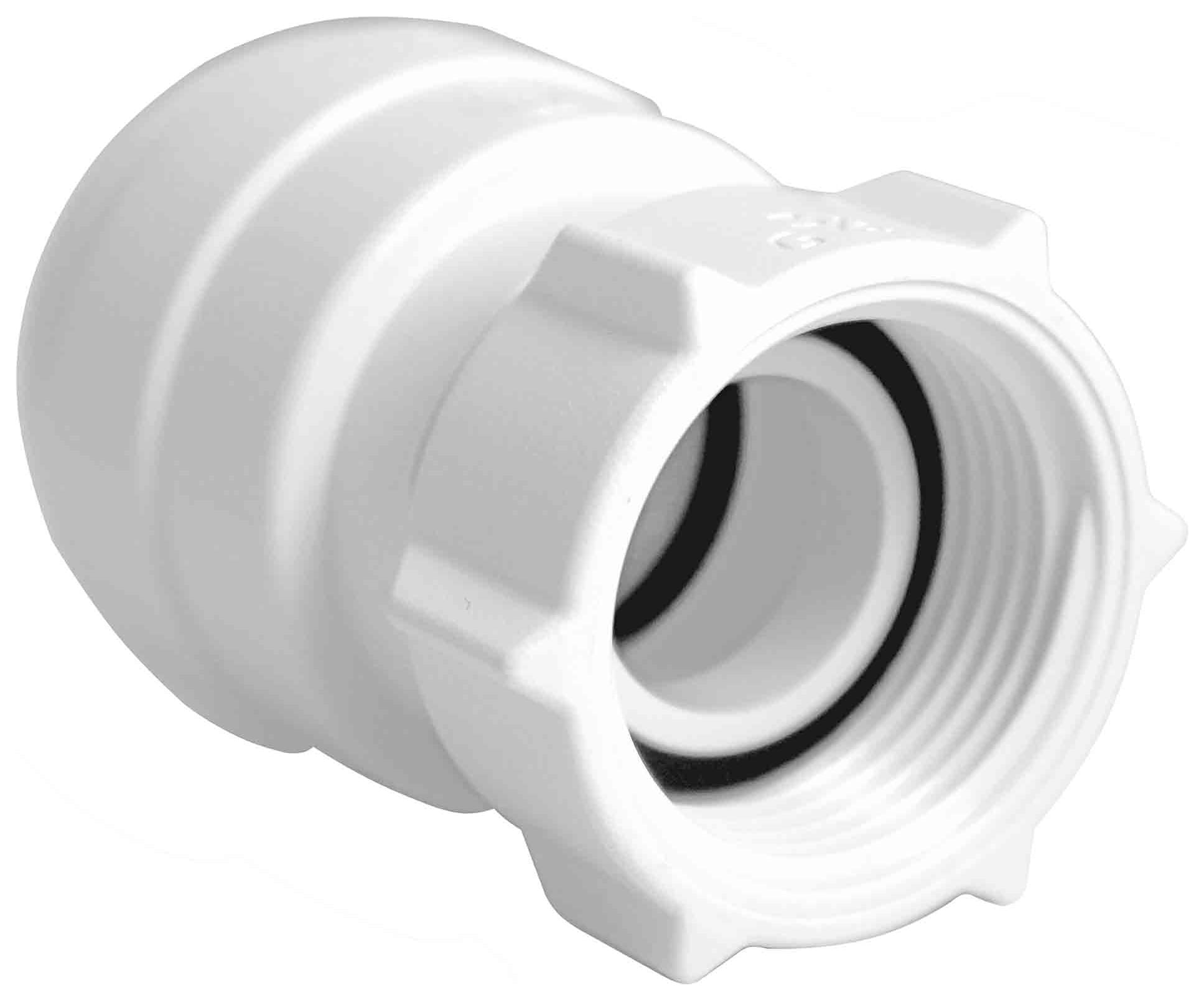 JG speedfit female coupler tap connector push-fit fitting for the connection of plastic or copper pipes to a male thread fixture or appliance. The female coupler is ideal for the connection of taps and toilets. Simply push the push-fit fitting fully onto the pipe and hand turn onto the thread. To demount the connection, push the collet towards the body of the push-fit fitting and pull the pipe to release. The JG speedfit female coupler tap connector is up to 40% faster to install than traditional methods and is easier to use in confined spaces by removing the need for hot works and tools.