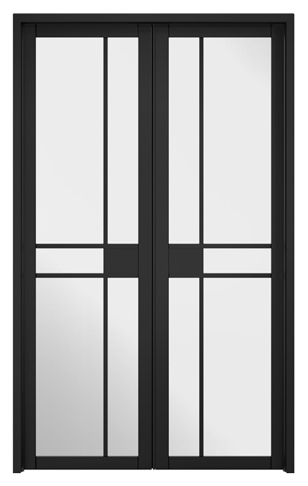 LPD Internal Greenwich Room Divider W4 Primed Black Solid Core Door creates a stylish and contemporary look that's ideal for opening a living area, but still keeping separate rooms. Featuring 2 doors with primed black finish and clear glazing. Please note, this door must be paired with LPD manhattan door hardware. Built with a solid core, it's a durable option perfect for adding character and style to any home.