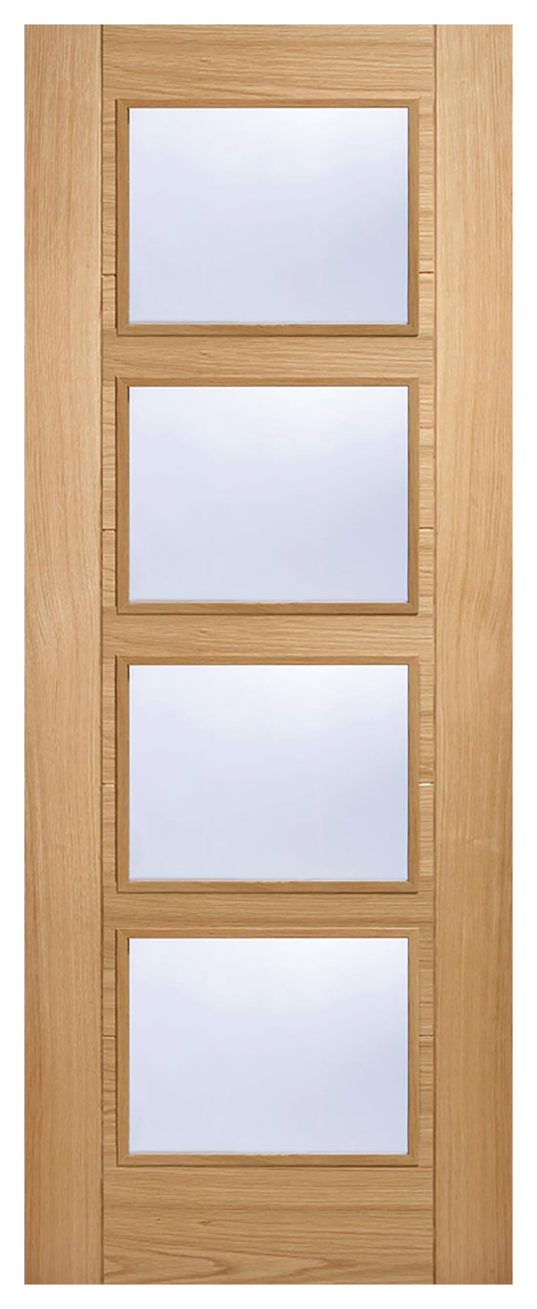 LPD Internal Vancouver 4 Lite Pre-Finished Oak Solid Core Door features raised moulding on both sides and four large clear glazed panels. The door is designed to make a statement in your interior, with its distinctive look and feel. This door would be ideal for feature rooms or home offices, as well as any area where the effect of the door is important. Built with a solid core, it's a durable option perfect for adding character and style to any home.