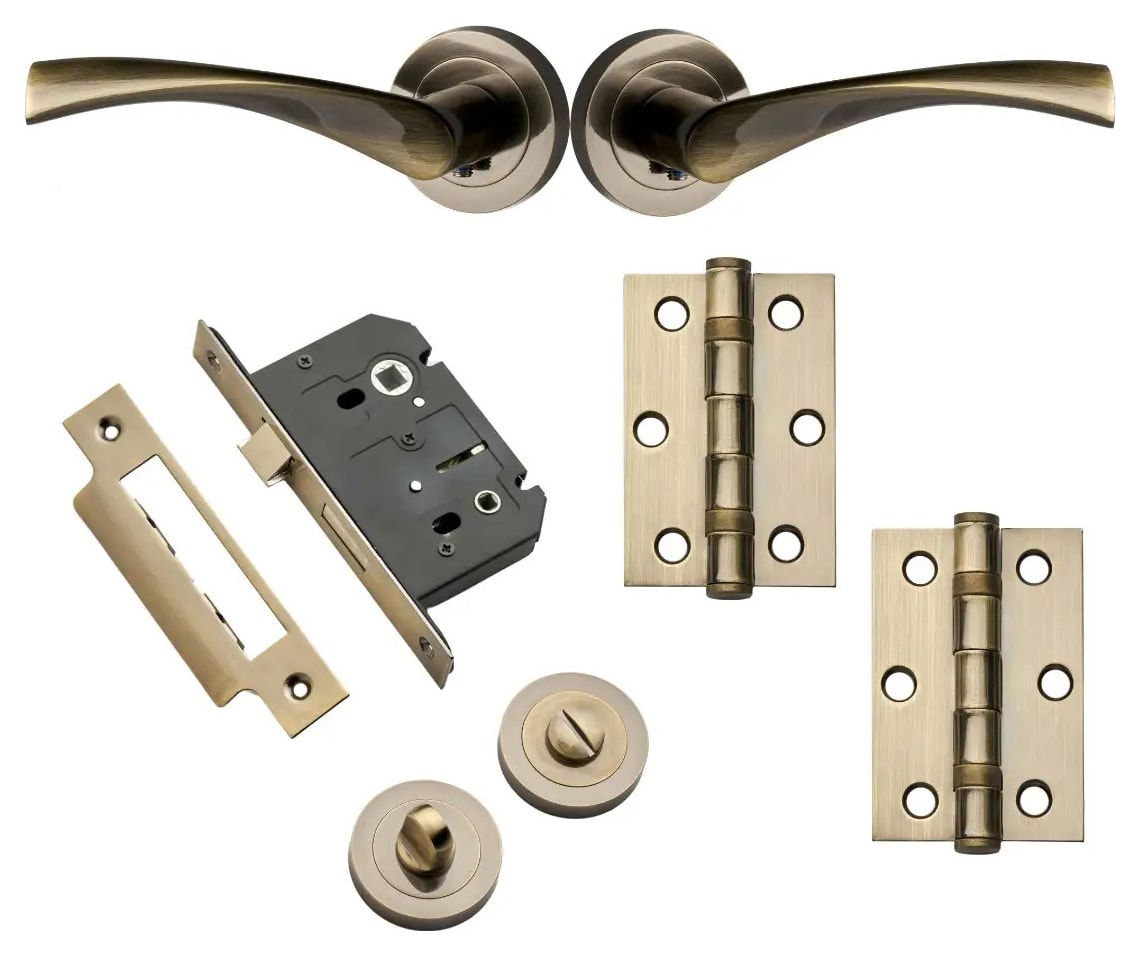 - Pack Contains: 1 x Pair of Lever on Rose Handles, 1 x 64mm Bathroom Lock, 1 x Bathroom Thumbturn Set, 1 x Pair of 76mm Ball Bearing Hinges